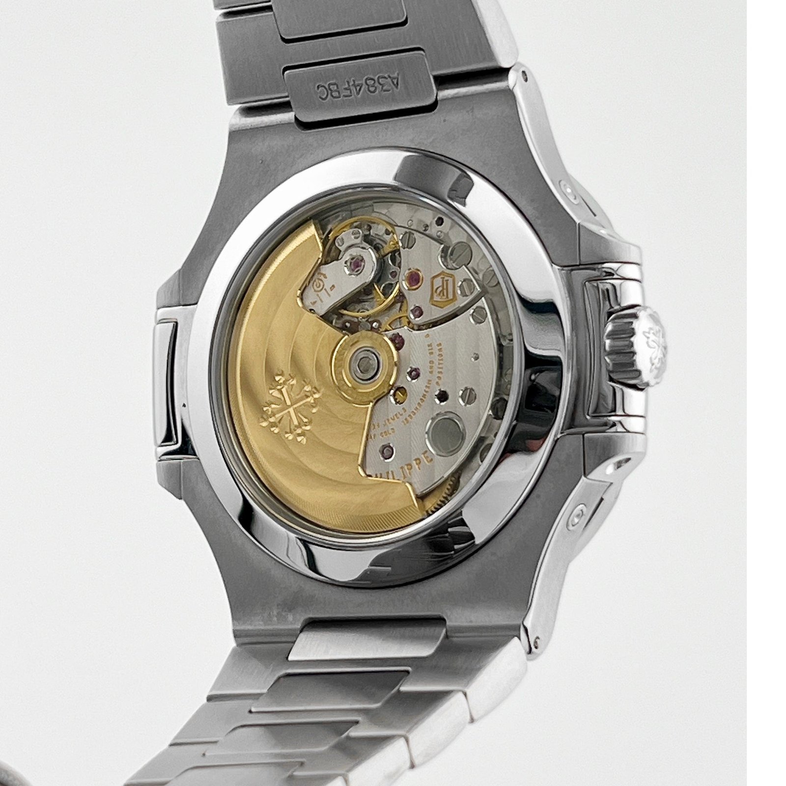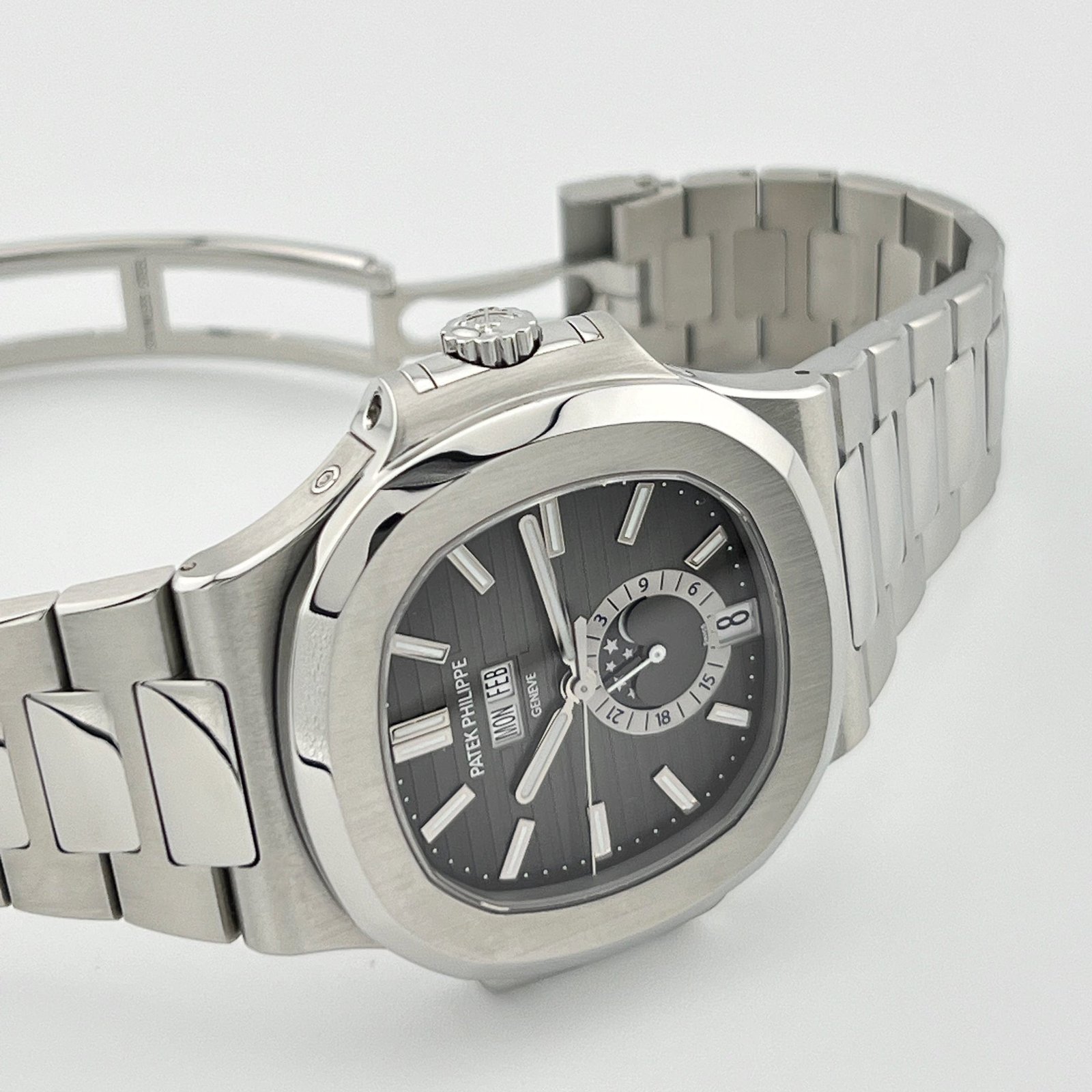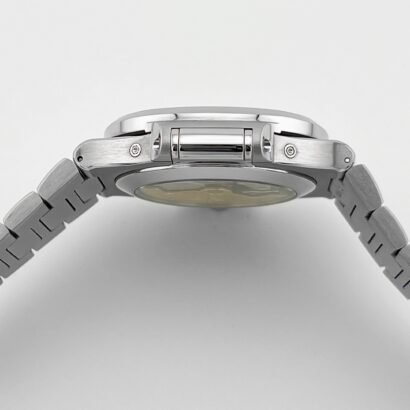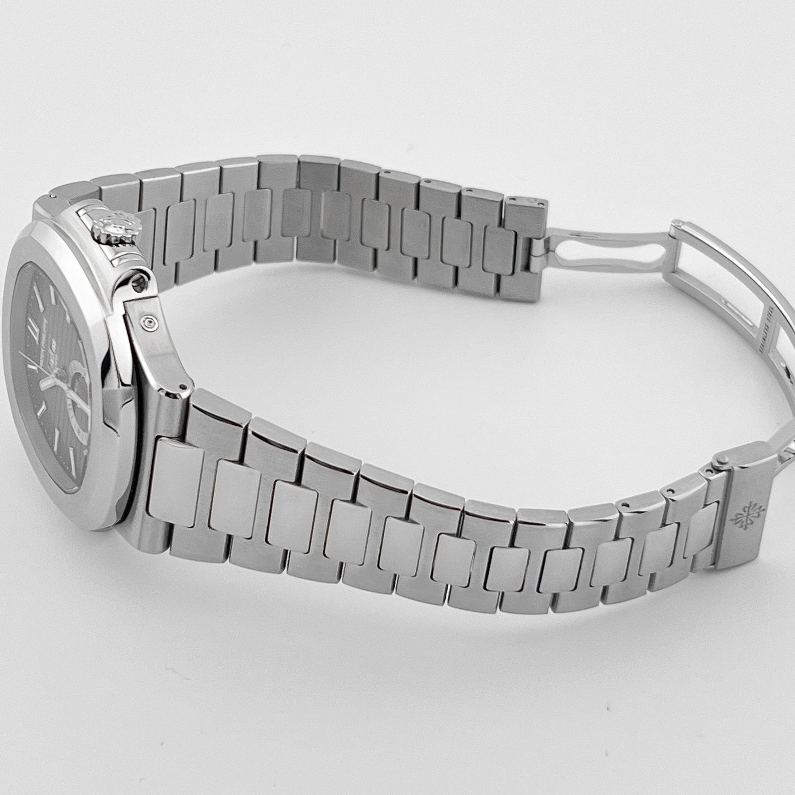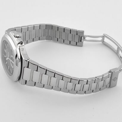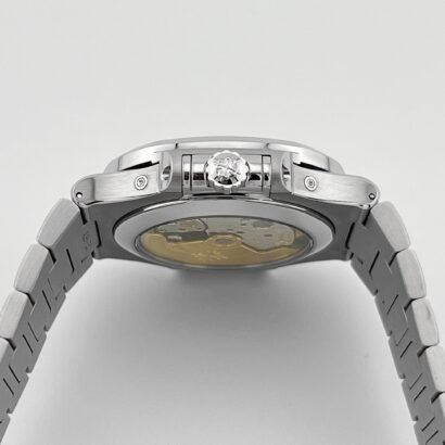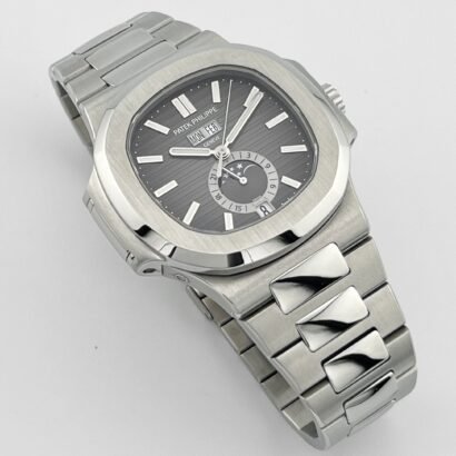 The annual calendar complication, requiring adjustment only once a year, showcases Patek Philippe’s innovative spirit. Inside, the caliber 324 S QA LU 24H/303 movement beats with precision, keeping track of time and intricate calendar functions. The transparent case back offers a window into the intricate movement, a testament to the brand’s commitment to impeccable craftsmanship. The integrated stainless steel bracelet embraces your wrist with comfort and style, seamlessly connecting with the case and completing the watch’s overall design. The Patek Philippe Nautilus Annual Calendar Moon Phase 5726/1A-001 is not just a watch; it’s a statement of sophistication and functionality. Whether you’re navigating your daily schedule or savoring the moonlit moments, this timepiece is a companion that combines the art of watchmaking with the rhythm of life.