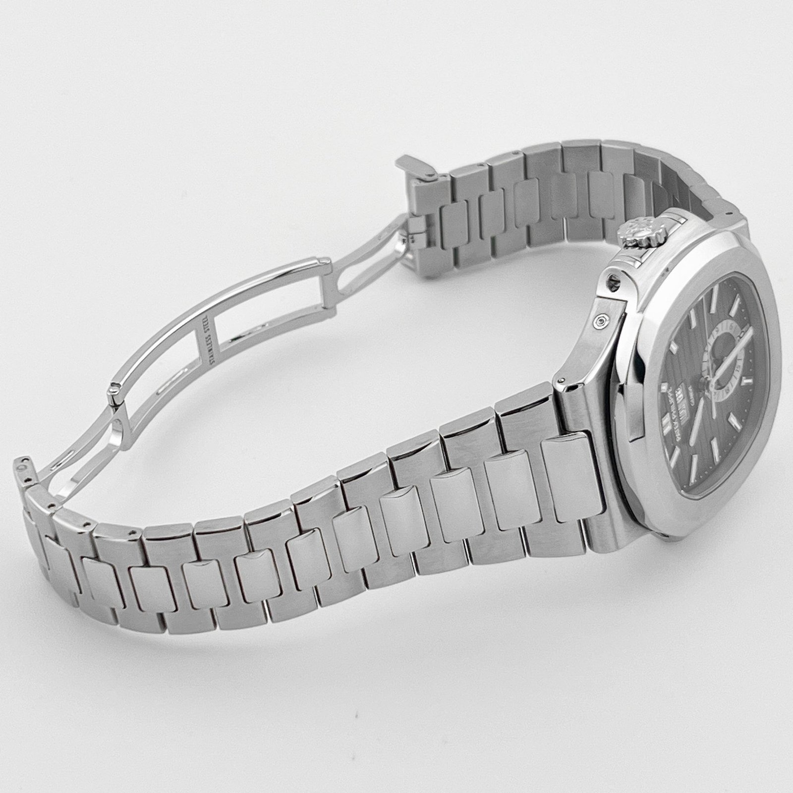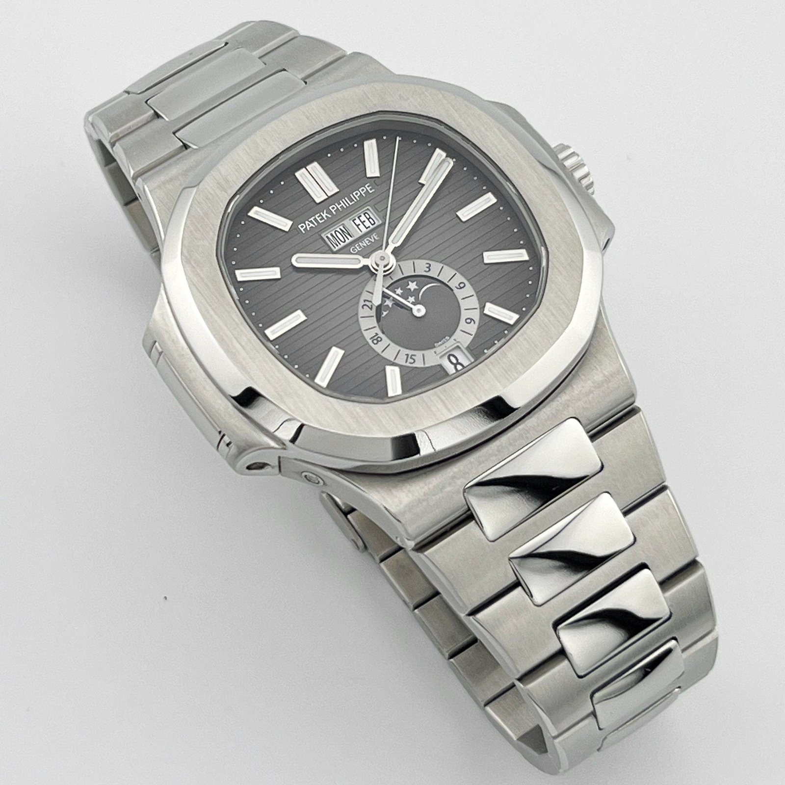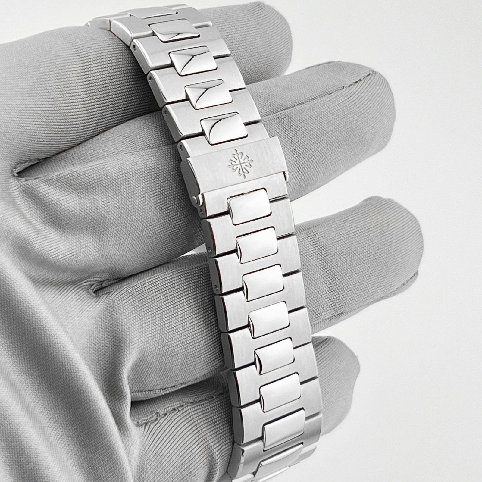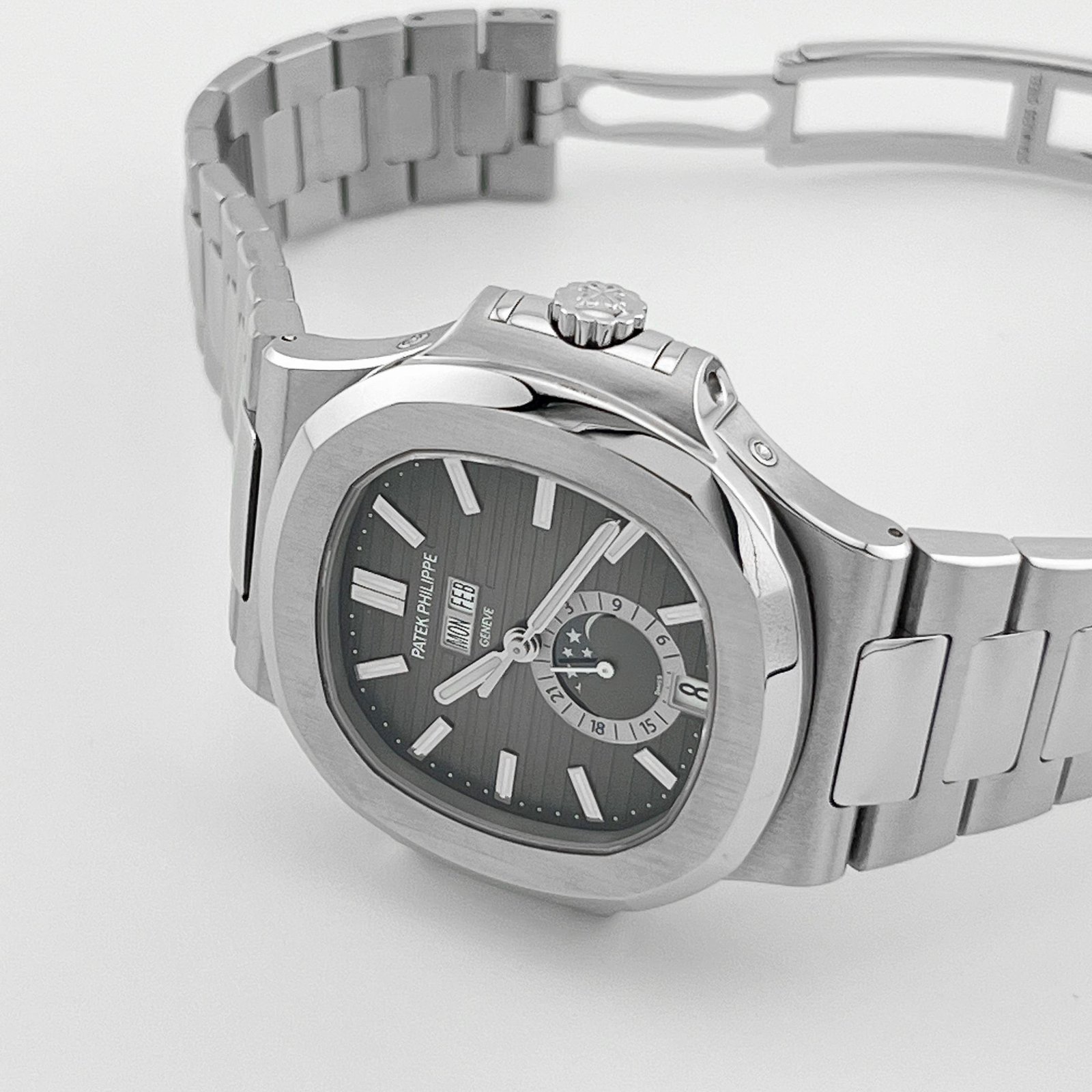 The annual calendar complication, requiring adjustment only once a year, showcases Patek Philippe’s innovative spirit. Inside, the caliber 324 S QA LU 24H/303 movement beats with precision, keeping track of time and intricate calendar functions. The transparent case back offers a window into the intricate movement, a testament to the brand’s commitment to impeccable craftsmanship. The integrated stainless steel bracelet embraces your wrist with comfort and style, seamlessly connecting with the case and completing the watch’s overall design. The Patek Philippe Nautilus Annual Calendar Moon Phase 5726/1A-001 is not just a watch; it’s a statement of sophistication and functionality. Whether you’re navigating your daily schedule or savoring the moonlit moments, this timepiece is a companion that combines the art of watchmaking with the rhythm of life.