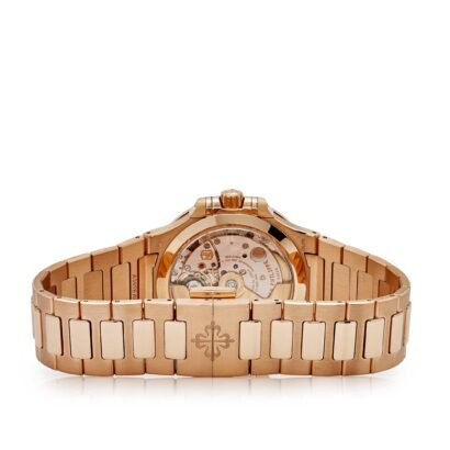 The integrated rose gold bracelet flows seamlessly from the case, secured by a double-folding clasp with Nautilus’ signature finishing—alternating satin-brushed and polished links that play with light as elegantly as the dial. Despite its precious metal construction, the watch remains supremely comfortable thanks to its ergonomic design and moderate dimensions.