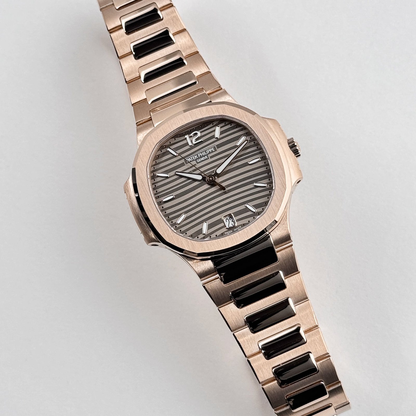 The champagne golden dial, with its signature embossed horizontal wave pattern, radiates warmth and elegance, perfectly complementing the rich rose gold tones of the case and bracelet.