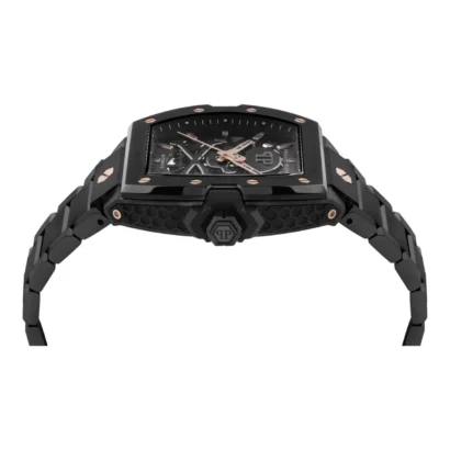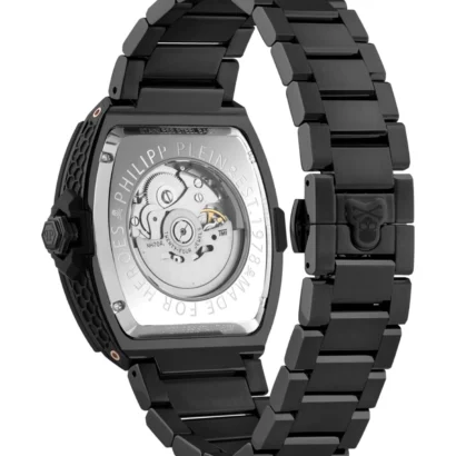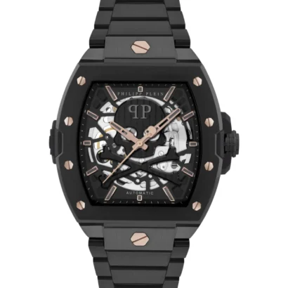 The Philipp Plein | The $keleton men’s wristwatch blends bold design with Swiss precision. Featuring a striking 44 mm tonneau-shaped stainless steel case finished in sleek black, this timepiece boasts a black dial with baton indexes and a black recycled stainless steel bracelet. Powered by a reliable 3-hand automatic movement and water-resistant up to 50 meters, it is perfect for both sport and formal occasions. The deployant closure adds secure comfort, while the 12.8 mm case thickness enhances its robust presence. Manufactured in 2025, this classic and luxurious watch comes with original packaging, a manual, and a 2-year manufacturer warranty.