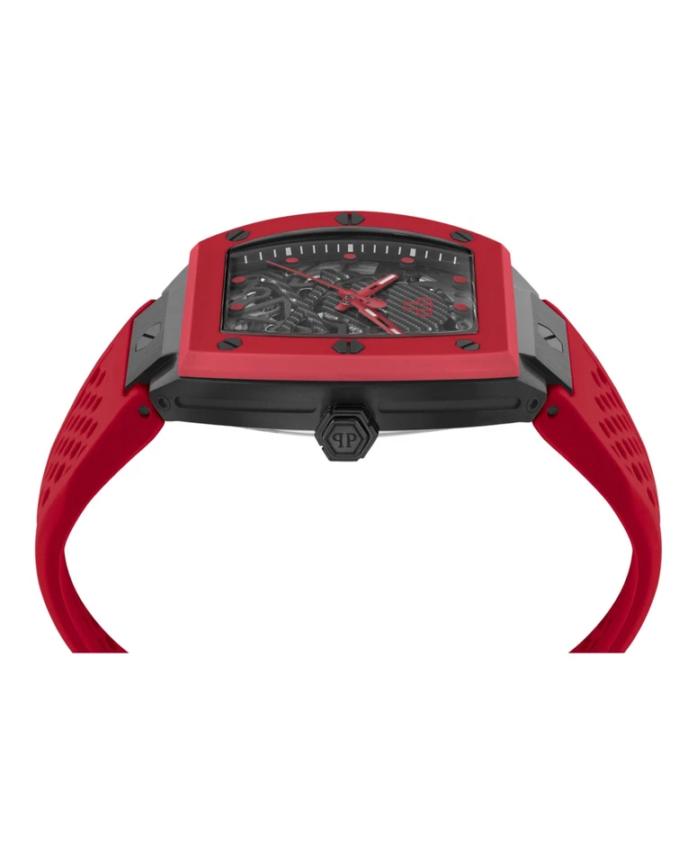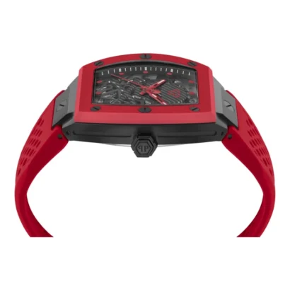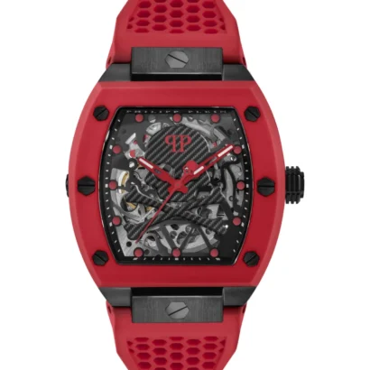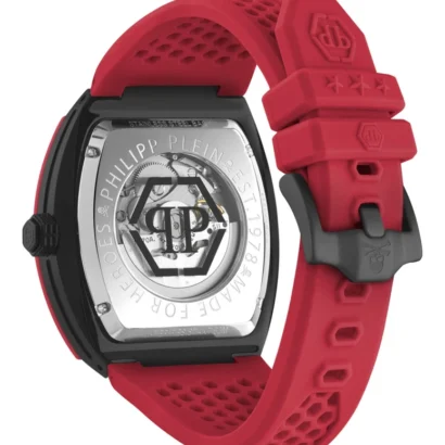 The Philipp Plein The $keleton PWBAA2224-BLACK-OS men’s wristwatch combines bold design with Swiss-made precision. Featuring a 44 mm tonneau-shaped stainless steel case with a striking black and red color scheme, this watch is equipped with a gray dial, red bezel, and round indexes for clear readability. The red silicone one-piece strap with buckle closure ensures a comfortable and secure fit. Powered by a reliable 3-hand automatic movement and offering 50 meters of water resistance, it’s perfect for both sporty adventures and luxury occasions.