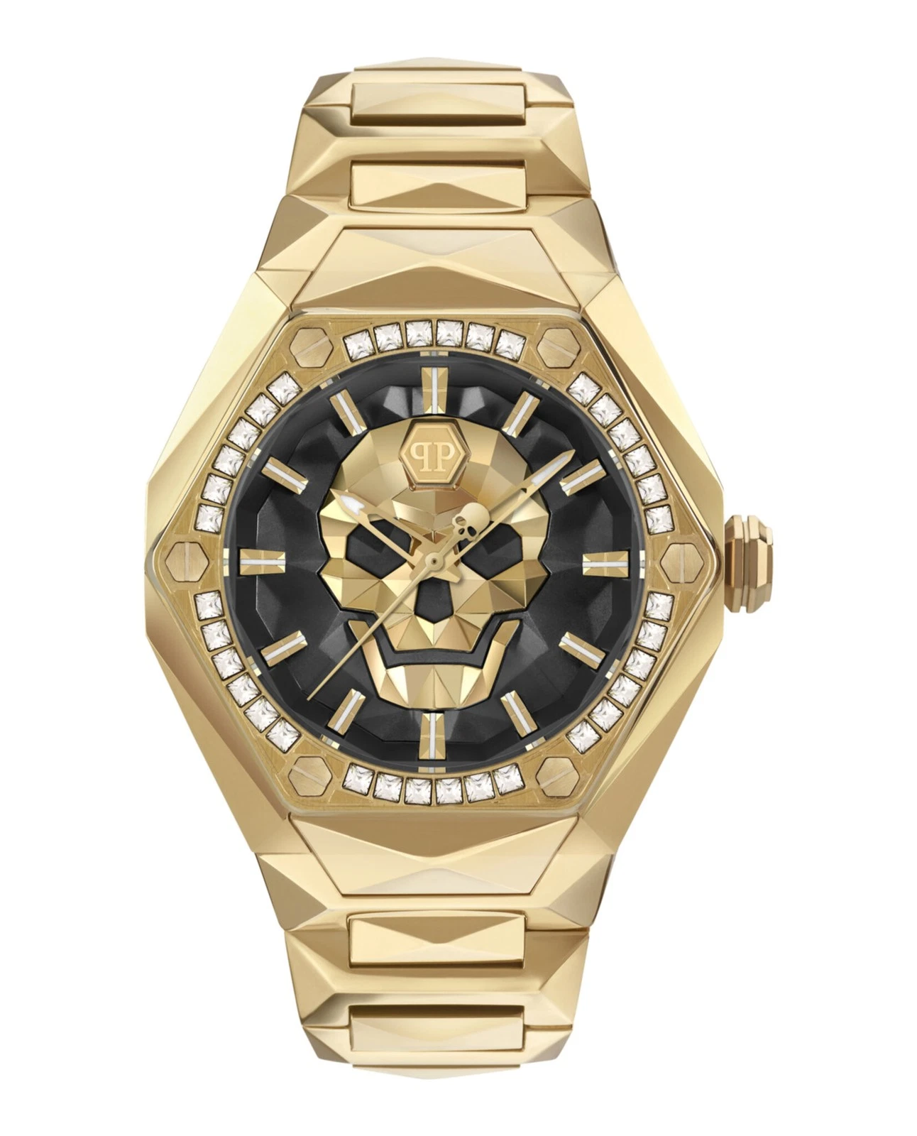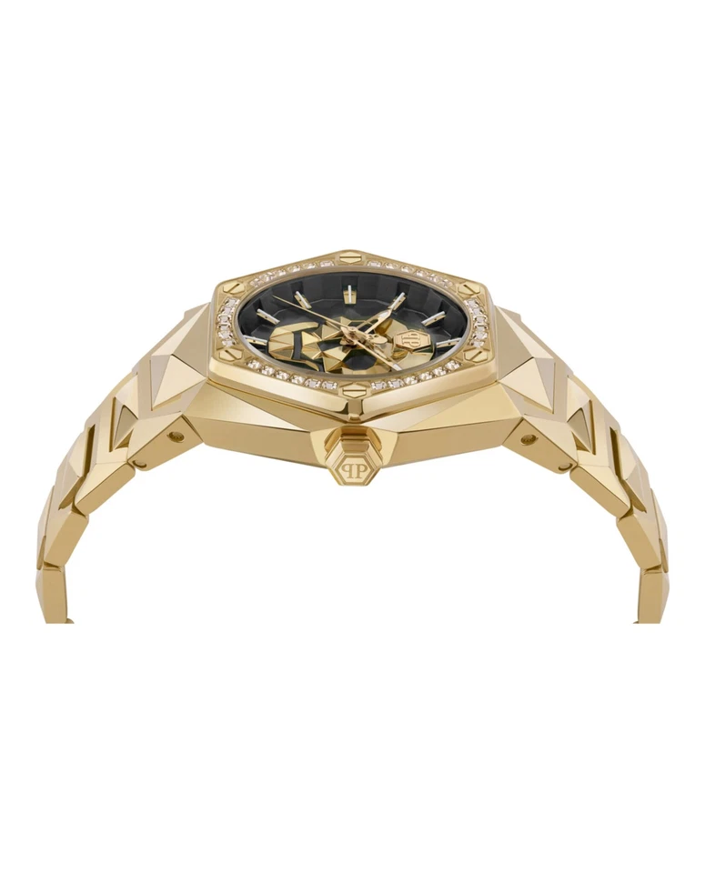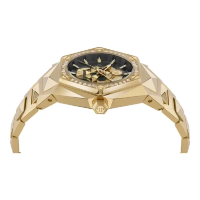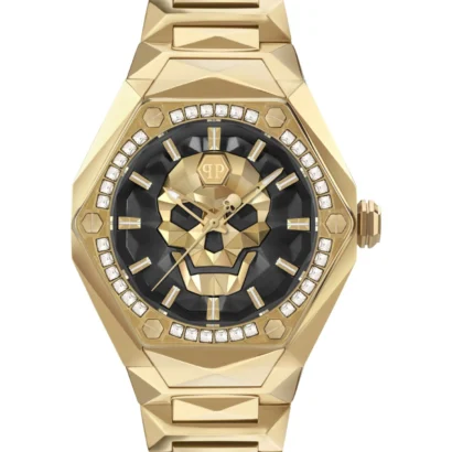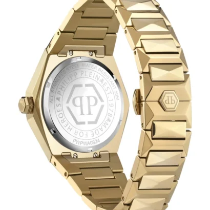 The Philipp Plein Date Superlative PWPWA0824 is a bold men’s timepiece that embodies luxury, strength, and modern style. Crafted with a 45 mm stainless steel case plated in gold, it commands attention with its striking presence. The black dial with baton indexes ensures easy readability, powered by a precise Swiss-made 3-hand quartz movement. The gold-tone bracelet made from recycled stainless steel not only adds sophistication but also reflects eco-conscious craftsmanship. With water resistance up to 50 m (5 ATM) and a secure deployant clasp, this watch is built for both elegance and everyday confidence.