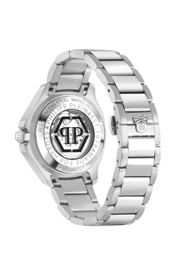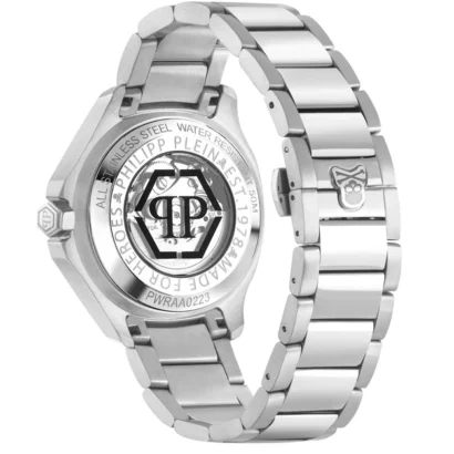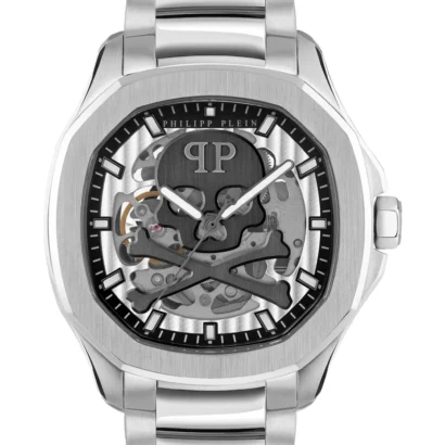 The Philipp Plein $keleton $pectre PWRAA0223 is a bold men’s timepiece that blends luxury and modern design. Built with a 42 mm stainless steel cushion-shaped case and matching silver bracelet, it delivers both durability and sophistication. The skeleton-inspired silver dial showcases its Swiss-made 3-hand automatic movement, offering precision and style. With a water resistance of 50 m (5 ATM) and a comfortable 22 mm stainless steel bracelet, this watch is perfect for both casual and formal settings. Supplied with the original box, manual, and 2-year manufacturer warranty, it is a statement accessory for the modern gentleman.