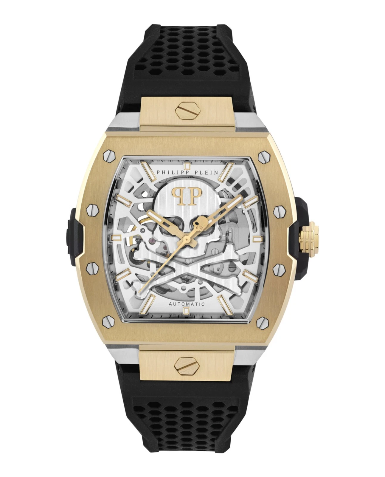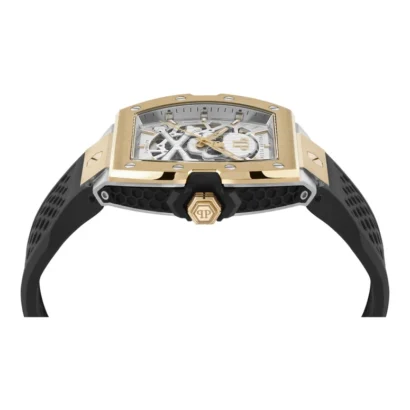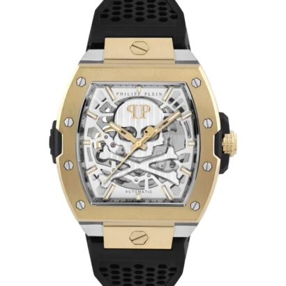 Showcase bold style and precision with the Philipp Plein The $keleton PWJFA0825-TTE-OS Men’s Watch, a statement timepiece that blends classic elegance with modern luxury. Featuring a stainless steel tonneau/barrel case with a gold bezel and a silver dial with baton indexes, this Swiss-made 3-hand automatic watch offers reliable performance and sophisticated design. Its one-piece black silicone strap and 44 mm case ensure comfort and style for classic, casual, formal, and sporty occasions.