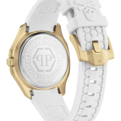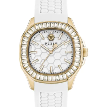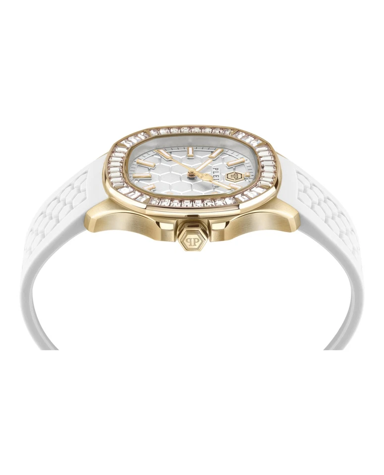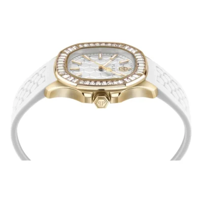 The Philipp Plein $pectre Lady PWTAA0924-GOLD1-OS women’s wristwatch is a chic and luxurious timepiece perfect for classic, casual, formal, and sport occasions. Featuring Swiss-made 3-hand quartz movement, a white analog dial with baton indexes, and a polished gold stainless steel case paired with a white silicone one-piece strap, it combines elegance and comfort. The 38 mm cushion-shaped case with 8.85 mm thickness, 50-meter water resistance, gold bezel, and original packaging with papers and manual make this 2025 model a stylish and reliable accessory for women who value fashion and functionality.