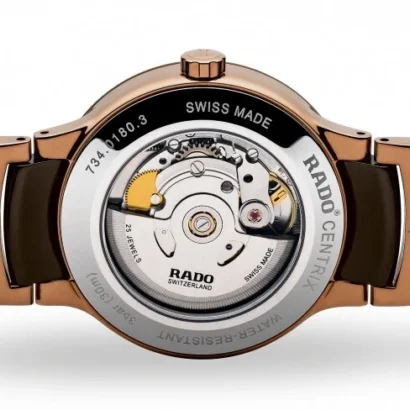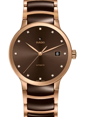 The Rado Centrix Automatic Diamond High Tech Ceramic Brown Dial Men’s Watch (Ref. R30036752) is a luxurious timepiece that combines precision with elegance. The 38mm stainless steel/PVD case is complemented by a brown dial with diamond accents, giving the watch a sophisticated yet modern look. Powered by a Swiss automatic movement, this watch offers a power reserve of up to 80 hours, ensuring reliable timekeeping. The transparent sapphire case-back provides a glimpse of the intricate movement inside, while the sapphire crystal protects the dial from scratches. The high-tech ceramic and stainless steel bracelet in brown and rose gold adds a touch of luxury, making it perfect for both classic and dress/formal settings. This watch also features a date indicator and is water-resistant up to 30m (3 ATM). The watch comes with original box, papers, and a 5-year manufacturer warranty, ensuring both authenticity and durability.
