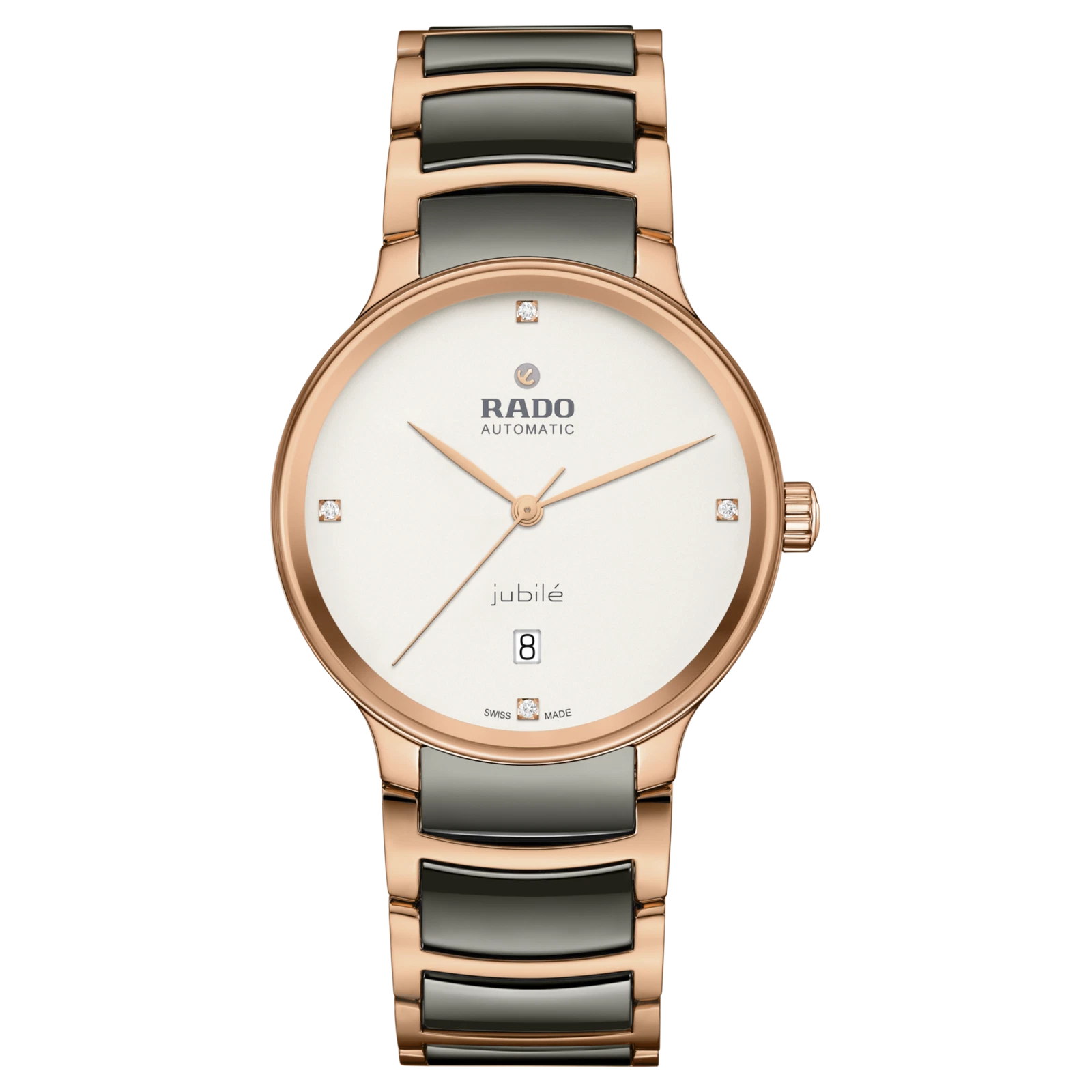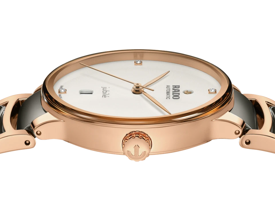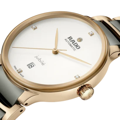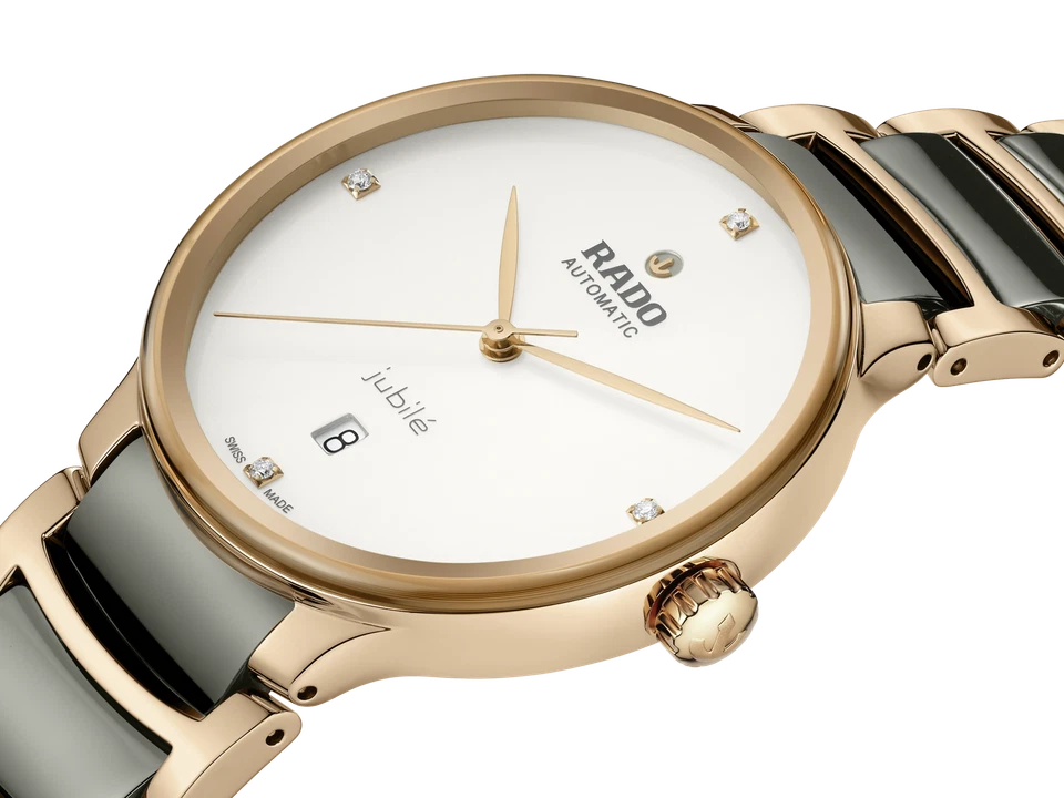 The Rado Centrix Automatic Diamonds watch masterfully combines avant-garde materials with classic Swiss luxury, featuring a distinctive 39.5mm case crafted from warm rose gold-tone stainless steel with a refined matte finish and seamlessly integrated with high-tech ceramic links in its two-tone gray and rose gold bracelet. The elegant white dial, protected by a scratch-resistant sapphire crystal, is adorned with sleek non-numeric hour marks and luxurious diamond accents at the indices, while the exhibition caseback reveals the precise Swiss automatic movement inside, boasting an impressive 80-hour power reserve. With a practical date indicator and a water resistance of 50 meters, this timepiece offers a perfect blend of sophisticated dress watch aesthetics and modern engineering, presented as a complete set with box, papers, certificate of authenticity, and backed by a 5-year manufacturer’s warranty for assured quality and timeless appeal.