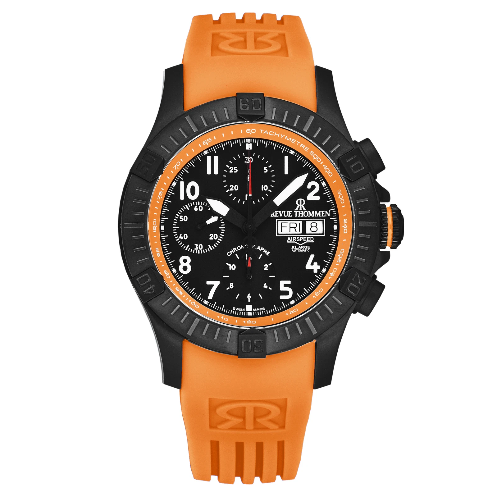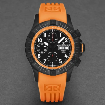 The Revue Thommen Air Speed 16071.6779 is a men’s luxury wristwatch designed for precision and style. It features a black stainless steel case paired with a black bezel and a vibrant orange rubber strap, giving it a bold, modern look. The black dial with Arabic numeral indices and chronograph functionality ensures easy readability and practical use. Powered by a mechanical automatic movement and protected with 100 meters (10 ATM) water resistance, this timepiece is reliable for daily wear and adventurous activities. Perfect for enthusiasts of luxury watches, the Air Speed combines sleek design with Swiss craftsmanship.
