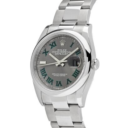 The Rolex Datejust 126200 is a timeless and versatile timepiece designed with a 36mm stainless steel case, offering a perfect balance of elegance and wearability. The slate dial provides a sophisticated backdrop, and the Roman numeral hour markers in green add a touch of luxury, reminiscent of the famous Wimbledon court.