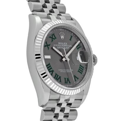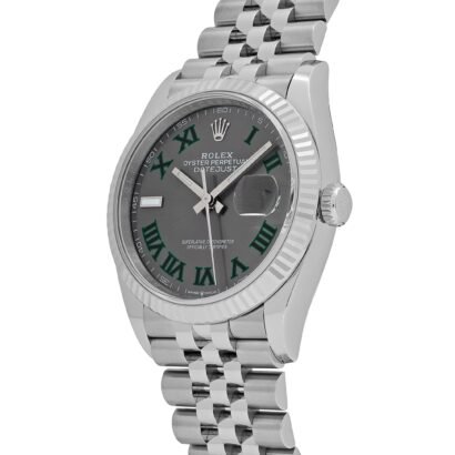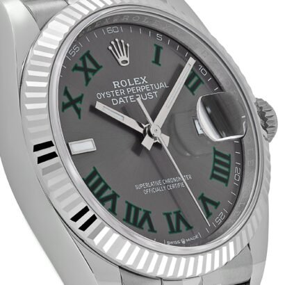At the heart of this reference is the striking slate grey dial, commonly referred to as the “Wimbledon” dial for its bold green Roman numeral hour markers—a nod to Rolex’s longstanding partnership with the famed tennis tournament. The Roman numerals are bordered in black for enhanced legibility, and the Cyclops lens at 3 o’clock magnifies the date window for easy reading.