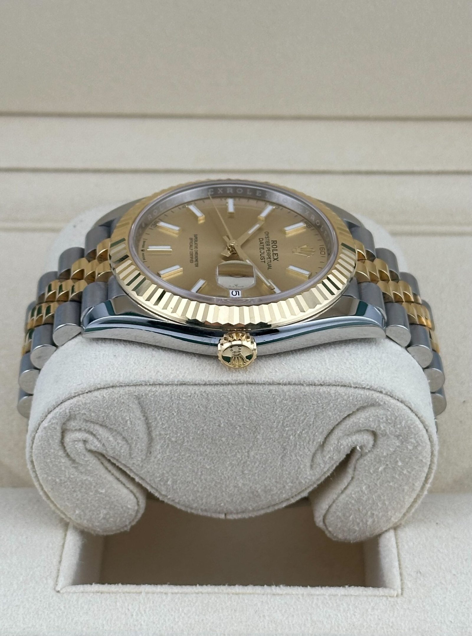 Embracing the captivating fusion of yellow gold and stainless steel, the Datejust 41 exudes a sense of opulence and refinement, destined to make a statement on any wrist. The champagne dial, adorned with luminous hour markers and the iconic date display at 3 o’clock, adds a touch of warmth and sophistication, complementing the watch’s overall allure.