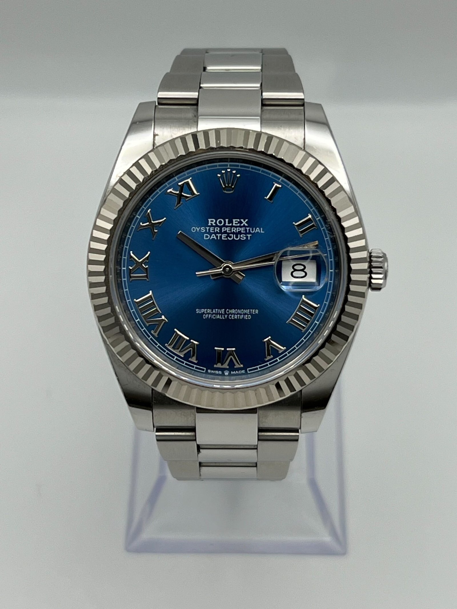 Crafted with durable stainless steel, the 41mm case exudes an aura of refinement and durability. The flawless bright blue dial serves as a canvas for the luminous silver hour markers and hands, creating a striking contrast that enhances readability and adds a touch of understated glamour.