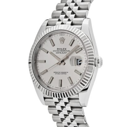 Crafted with durable stainless steel, the 41mm case exudes an aura of refinement and durability. The flawless silver dial serves as a canvas for the luminous silver hour markers and hands, creating a striking contrast that enhances readability and adds a touch of understated glamour.