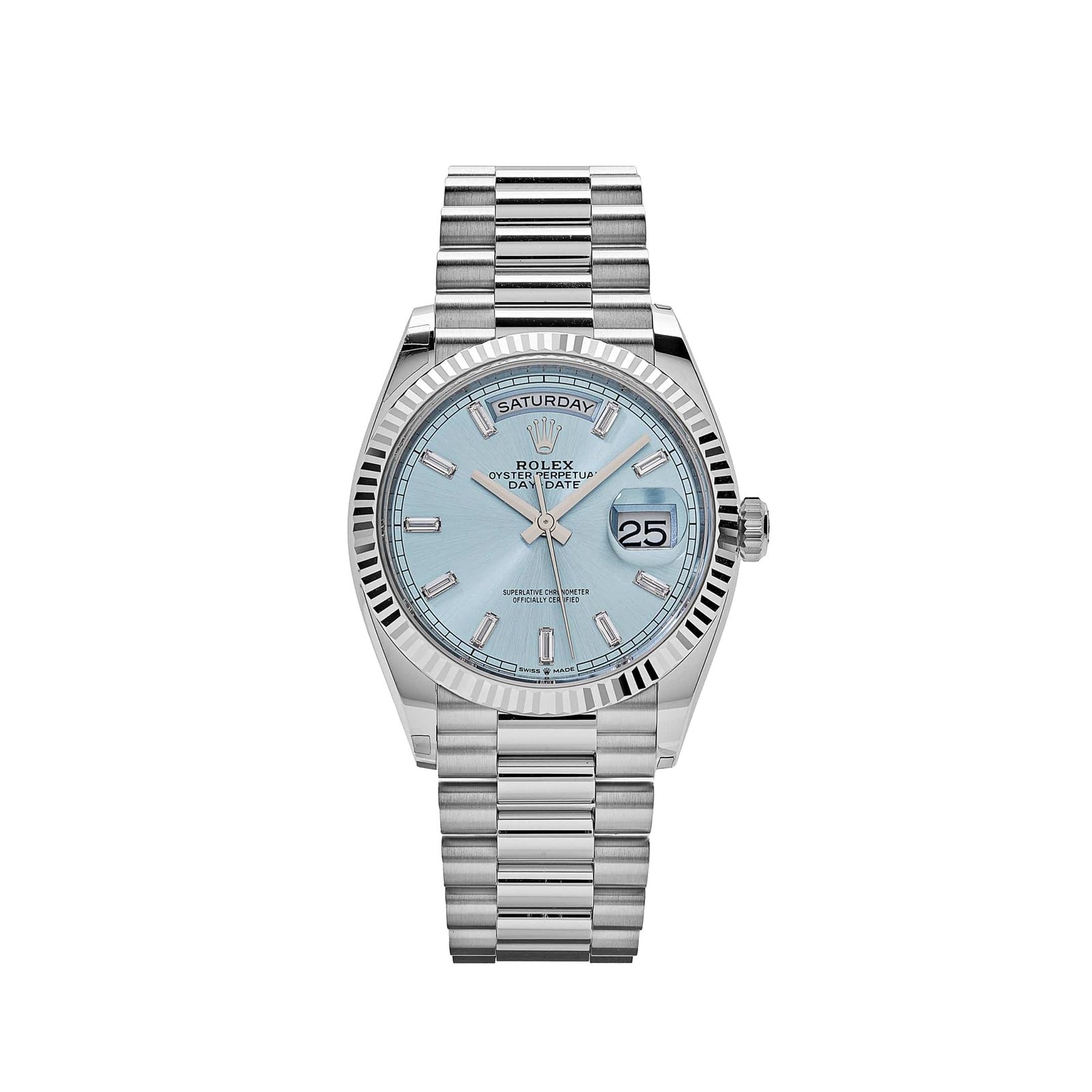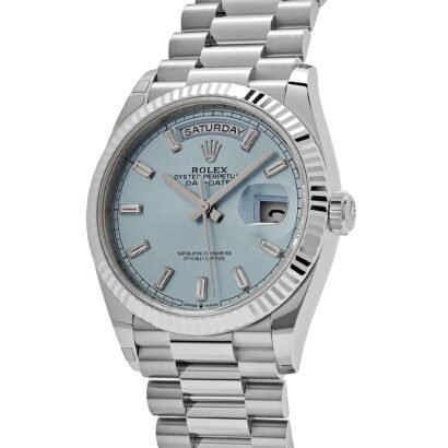 The ice blue dial, reserved exclusively for Rolex platinum models, adds an air of exclusivity and sophistication. Its serene hue contrasts beautifully with the bold baguette-cut diamond hour markers, each meticulously set to enhance the dial’s understated elegance. The dial is perfectly balanced with the signature day display at 12 o’clock and the date window at 3 o’clock, magnified by the iconic Cyclops lens. Together, these features maintain the timeless aesthetic of the Day-Date while offering practicality and exceptional legibility.