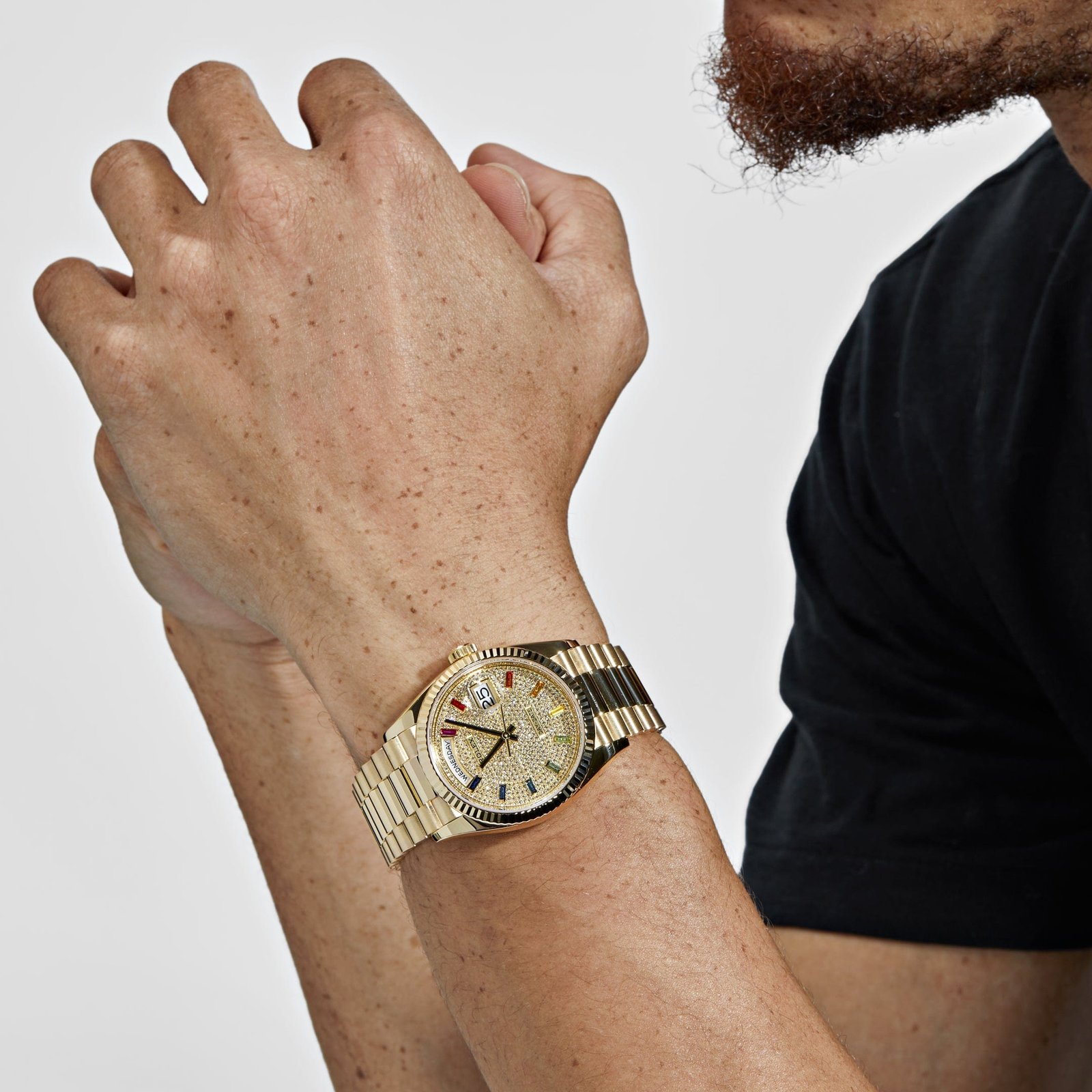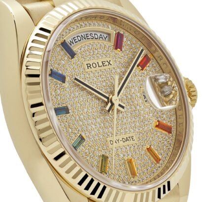 The Rolex Oyster Perpetual Day-Date 128238 is a symbol of luxury and sophistication, housed within a 36mm case crafted from radiant 18k yellow gold. Its opulent dial is adorned with a stunning array of diamonds, forming a captivating backdrop for 10 baguette-cut sapphires in a rainbow of colors. The iconic fluted bezel, characteristic of Rolex’s esteemed design, adds a touch of elegance and distinction.