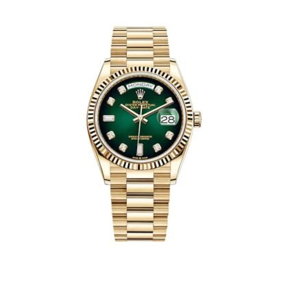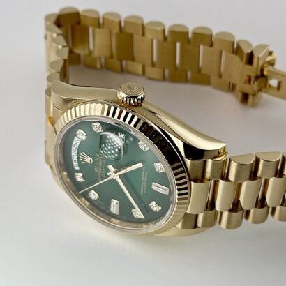Introducing the Rolex Day-Date 36 Yellow Gold Green Diamond Dial 128238, a timepiece that exudes timeless elegance, luxury, and refined taste. Crafted from exquisite 18k yellow gold, this watch is a true symbol of prestige and exclusivity.