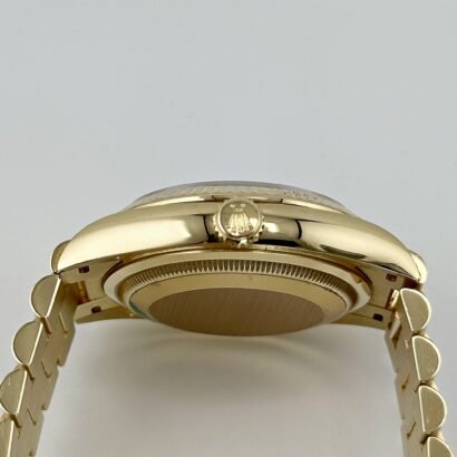 The 36mm case of this Rolex Day-Date 36 showcases the perfect balance between classic proportions and modern versatility. The yellow-gold construction radiates a warm and captivating glow, making a bold statement on the wrist. The polished finish adds an extra touch of sophistication to this exceptional timepiece.