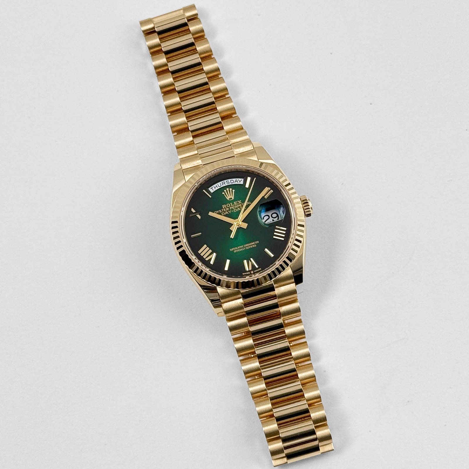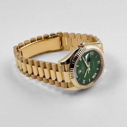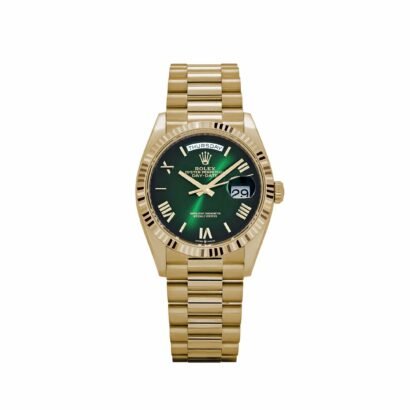 The green ombre dial is the centerpiece of this reference, offering a captivating gradient that transitions from a vibrant green at the center to a deeper, richer tone at the edges. This dynamic effect creates a sense of depth and sophistication, making the dial a true standout feature. The polished Roman numeral hour markers, rendered in yellow gold, provide a striking contrast to the dial’s rich hue, combining classic elements with modern design sensibilities. The day display at 12 o’clock and date window at 3 o’clock, magnified by Rolex’s iconic Cyclops lens, remain defining features of the Day-Date collection, offering both functionality and elegance.