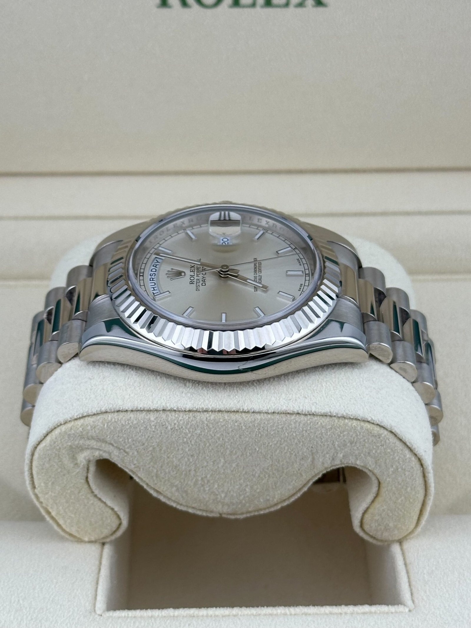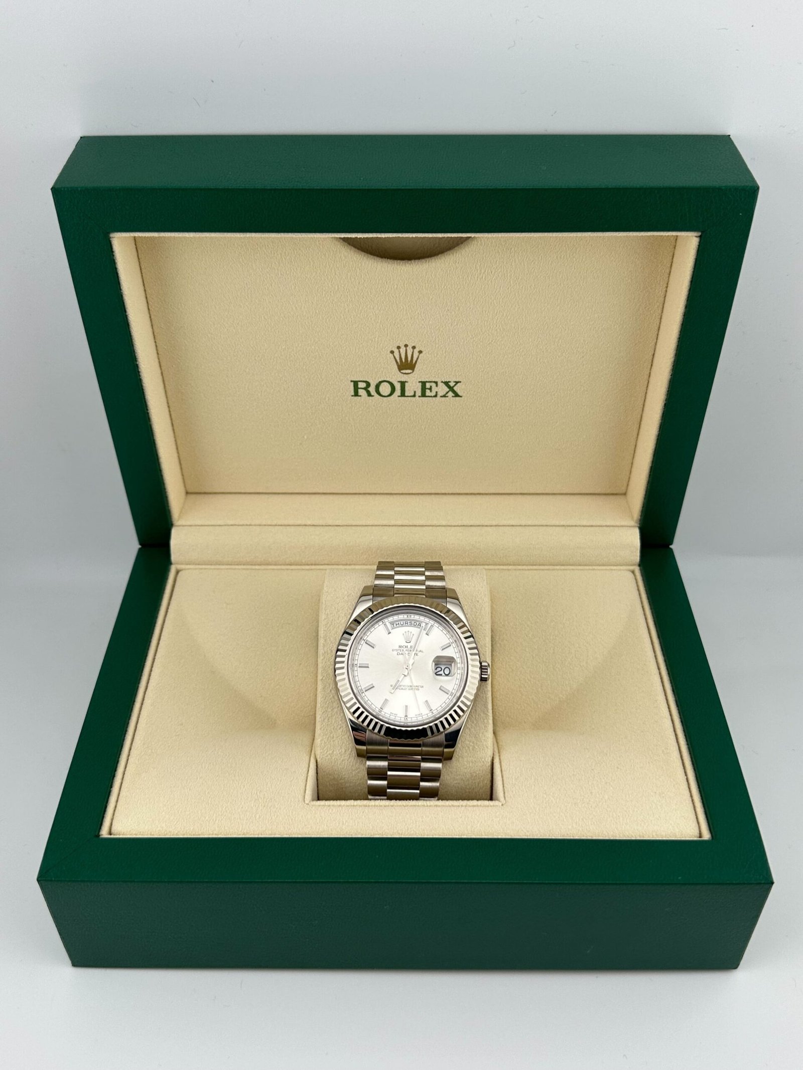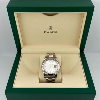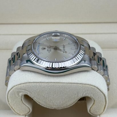 The silver sunburst dial exudes understated sophistication, with a radiant finish that plays beautifully with light. White gold-applied hour markers and hands ensure optimal legibility, while maintaining a clean and minimalist aesthetic. The hallmark day display at 12 o’clock and the date window at 3 o’clock, magnified by Rolex’s iconic Cyclops lens, create a layout that is both functional and instantly recognizable. This elegant design reinforces the Day-Date’s status as the ultimate symbol of success and refinement.