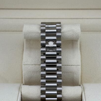 Fitted with the prestigious President bracelet, exclusively available for Day-Date models, this timepiece delivers unparalleled comfort and style. The bracelet’s semi-circular three-piece links, crafted in white gold, seamlessly integrate with the case to create a cohesive and luxurious profile. The concealed Crownclasp provides a secure and elegant closure, ensuring a flawless finish.