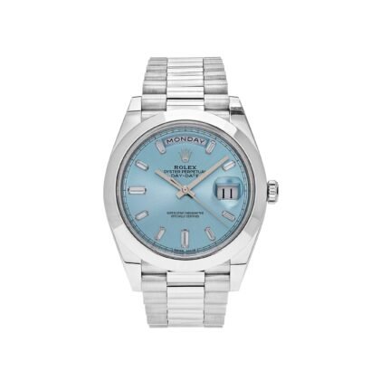 Introducing the Rolex Day-Date 40 Platinum Ice Blue Diamond Dial 228206, a true embodiment of timeless elegance and exquisite craftsmanship. This extraordinary timepiece combines the allure of platinum, the captivating beauty of an ice-blue dial, and the brilliance of diamonds to create a horological masterpiece that will captivate your senses.