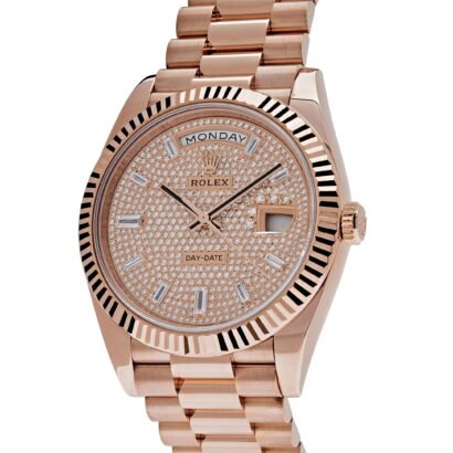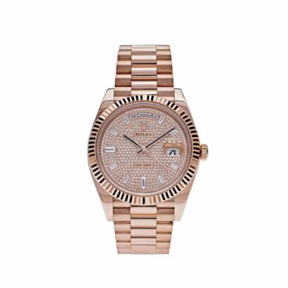 Indulge in the epitome of luxury with the Rolex Day-Date 228235, a timepiece that transcends time and exudes sophistication. Crafted with meticulous attention to detail, this horological masterpiece features a refined 40mm 18k rose gold case that captivates with its timeless elegance. Adorning the dial is a mesmerizing display of luxury, with a diamond-paved surface adorned with 10 radiant baguette-cut diamonds, adding a touch of brilliance to every glance. The iconic fluted bezel, a signature Rolex design element, further enhances its allure, showcasing the brand’s commitment to excellence.