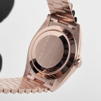 Crafted from exquisite 18k rose gold, the case of this Rolex Day-Date 40 exudes a warm and radiant glow, symbolizing opulence and refinement. Its 40mm size strikes the perfect balance between boldness and sophistication, making it a versatile choice for any occasion. The polished finish adds an extra touch of luxury to this remarkable timepiece.