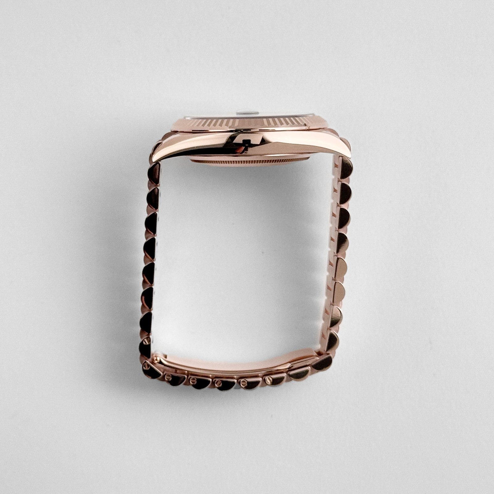 The olive green dial of this watch adds a distinctive and captivating touch to its overall design. The rich and earthy hue evokes a sense of sophistication and exclusivity. The sunray finish creates a dynamic interplay of light, adding depth and dimension to the dial. The luminous rose gold hour markers elegantly contrast against the olive green backdrop, ensuring optimal legibility and enhancing the watch’s overall aesthetic.