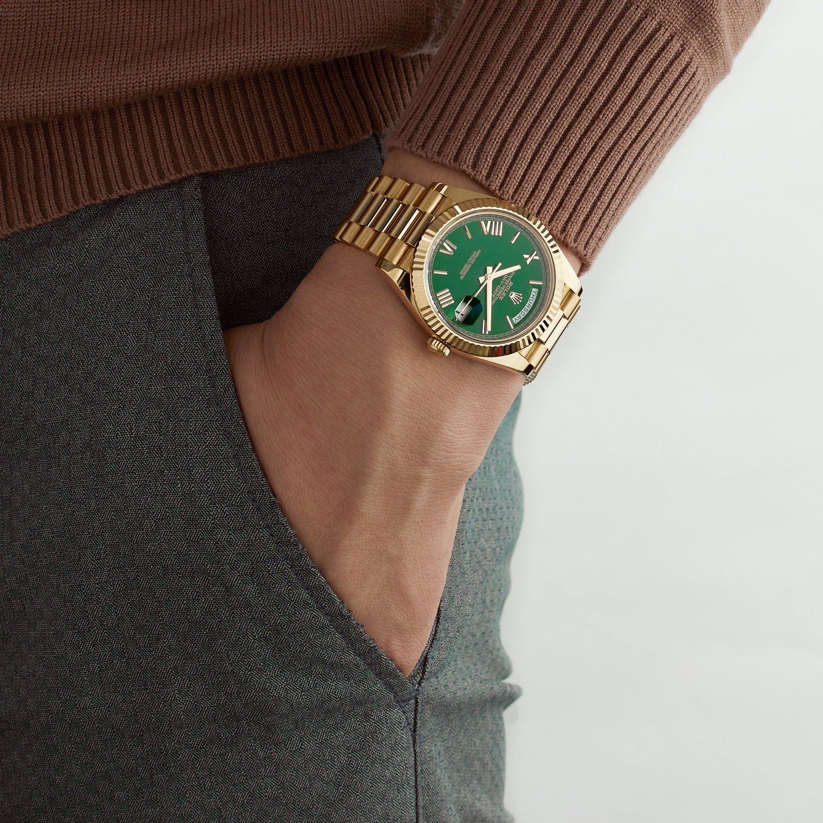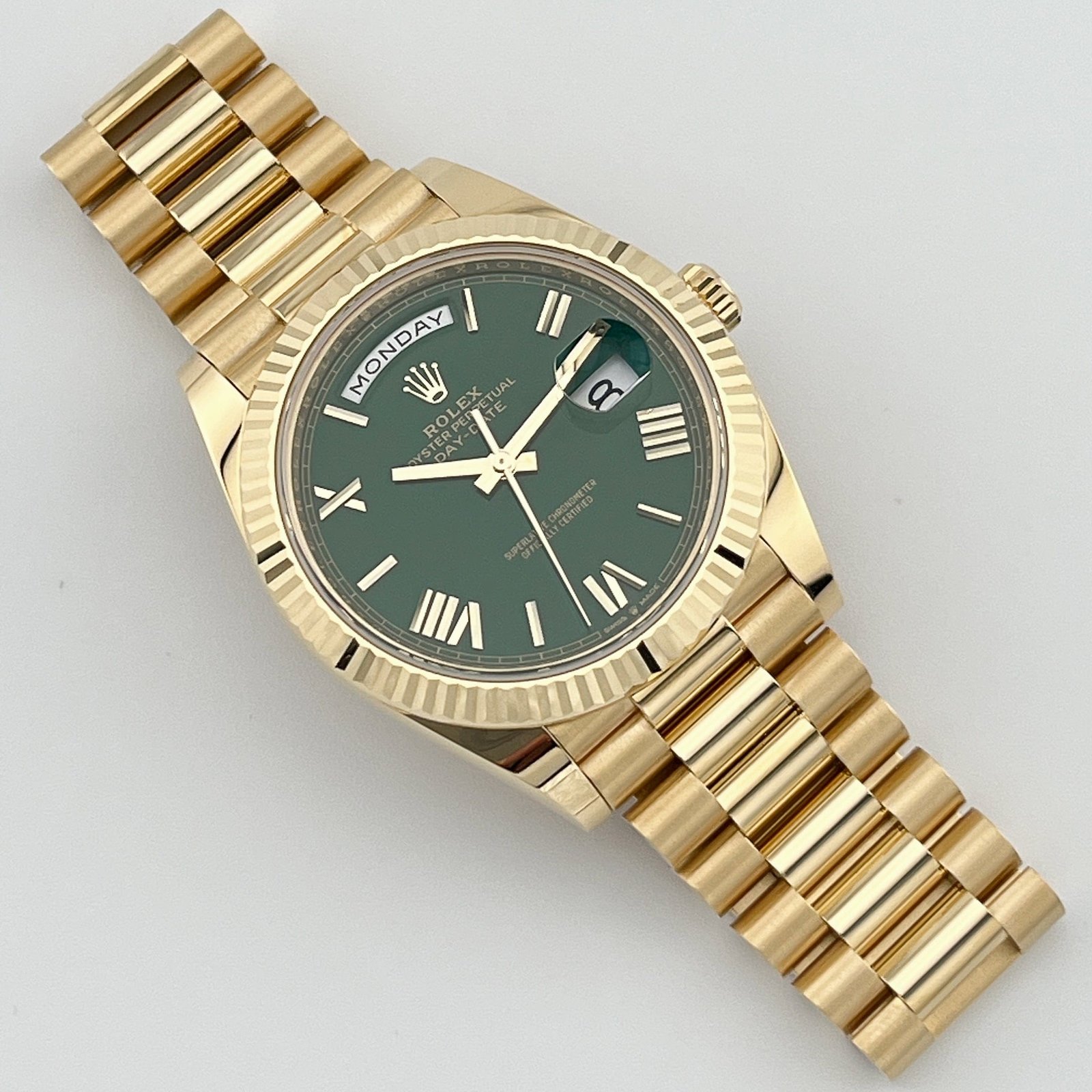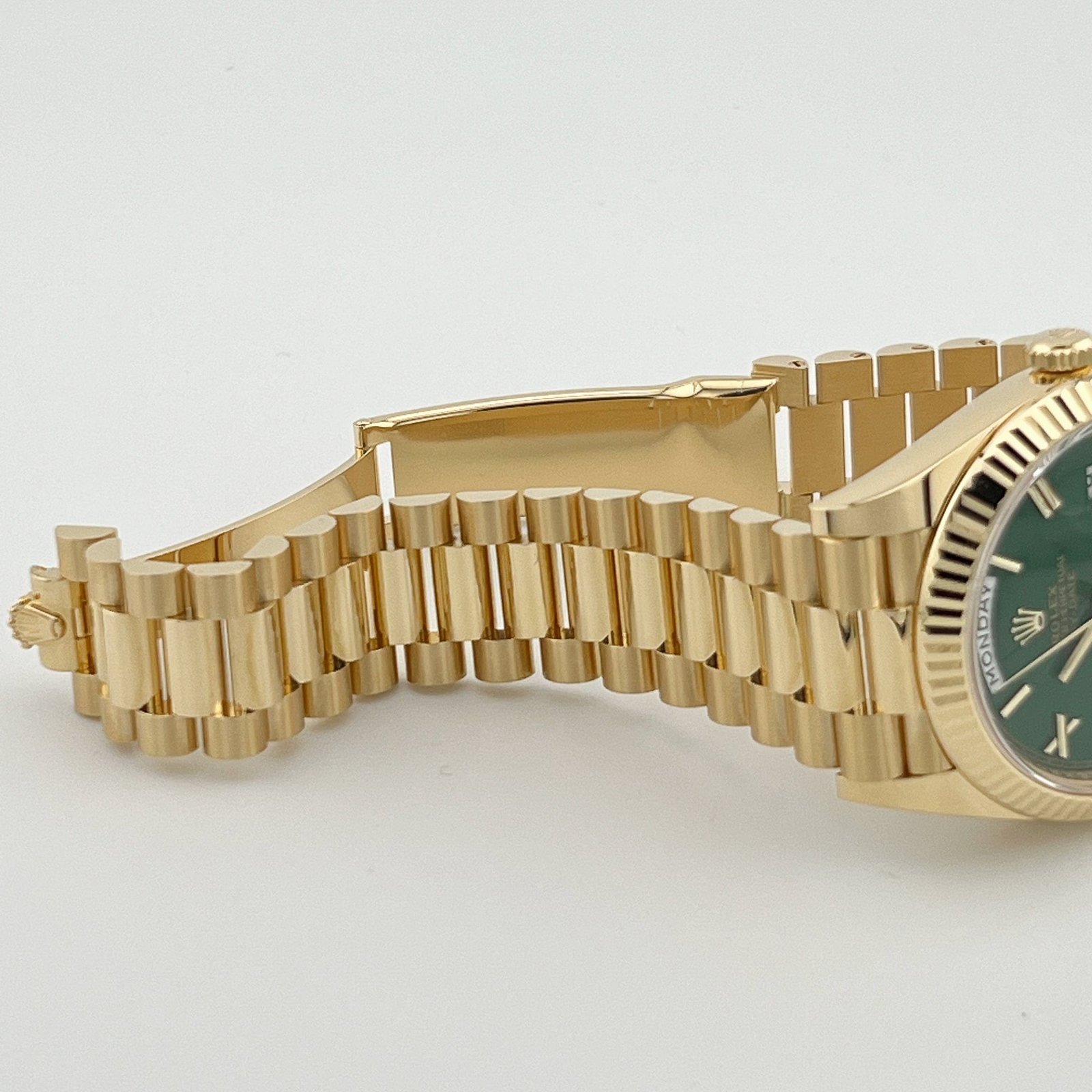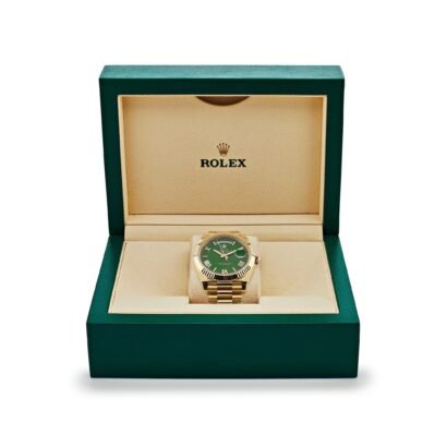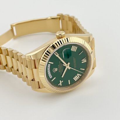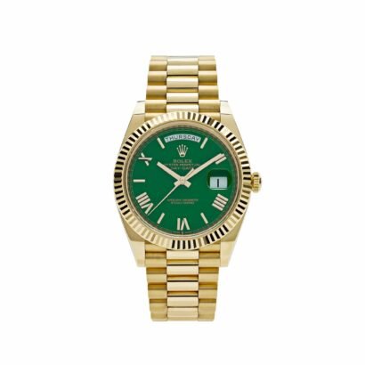 Encased within a sophisticated 40mm 18k yellow gold case, the Day-Date exudes timeless elegance and refinement. The luminous green dial, adorned with yellow gold Roman numeral markers and hands, captivates the eye with its vibrant hue and impeccable craftsmanship. This striking color combination creates a bold yet sophisticated statement, making it a standout addition to any collection.