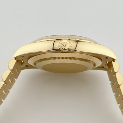 Powered by the caliber 3255 Manufacture Rolex movement, the Day-Date boasts impressive functionality and performance. Featuring a perpetual, mechanical, self-winding movement, it offers precise timekeeping and reliable performance in any situation. With approximately 70 hours of power reserve, you can trust that this watch will keep ticking day after day, year after year, making it a true symbol of luxury and prestige.
