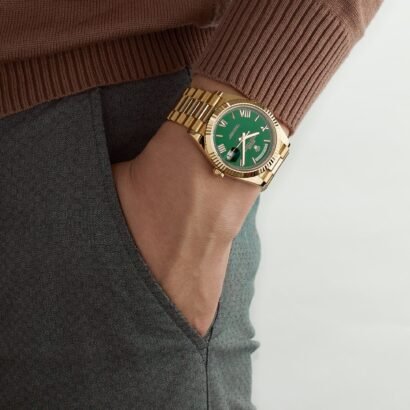Equipped with a scratch-resistant sapphire crystal and a Cyclops lens over the date, the Day-Date is both durable and practical, ensuring optimal readability and protection against the elements. With a water resistance of up to 100 meters (330 feet), it is suitable for both everyday wear and more adventurous pursuits.