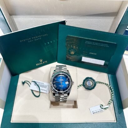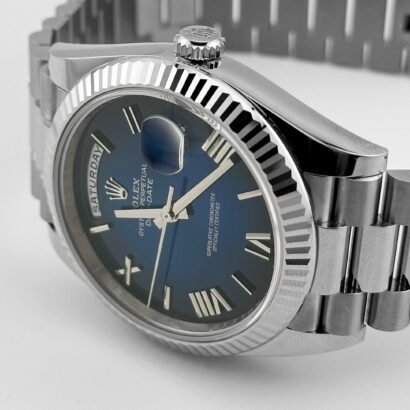 The Rolex Day-Date 40 Ref. 228239 in 18k white gold with a blue ombré Roman numeral dial is a masterful expression of elegance, exclusivity, and technical refinement. As part of Rolex’s flagship Day-Date collection—often referred to as the “President’s Watch”—this reference combines precious metal craftsmanship with one of the most visually striking dials in the current lineup.