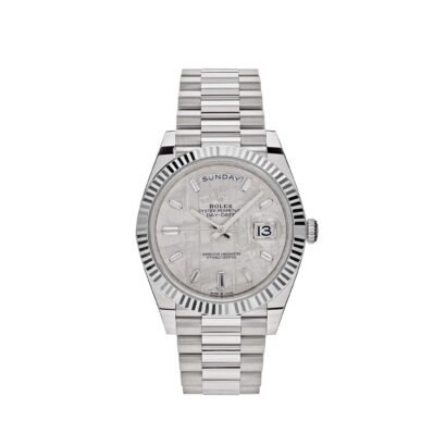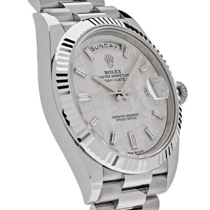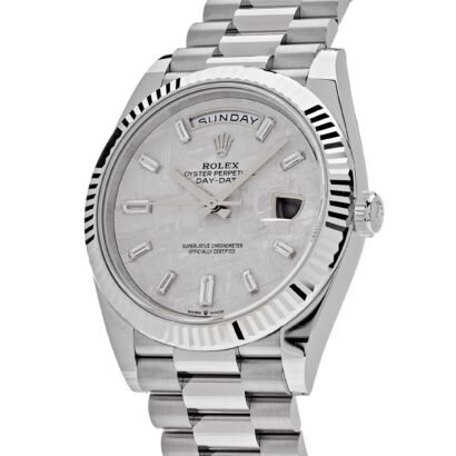 Experience the pinnacle of luxury and sophistication with the Rolex Day-Date 40 White Gold Meteorite Diamond Dial 228239. This extraordinary timepiece combines the celestial beauty of a meteorite dial with the brilliance of diamonds, resulting in a watch that is truly out of this world.
