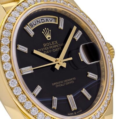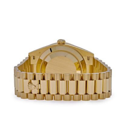 Crafted from exquisite 18k yellow gold, the case of this Rolex Day-Date 40 emanates a warm and radiant glow, symbolizing opulence and refinement. Its 40mm size strikes the perfect balance between boldness and elegance, making a statement on the wrist without overwhelming. The diamond-set bezel adds a touch of captivating brilliance, further enhancing the watch’s allure.
