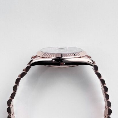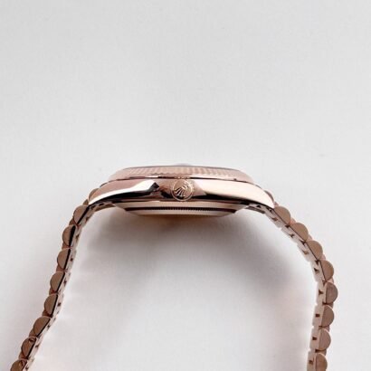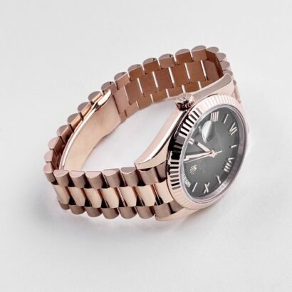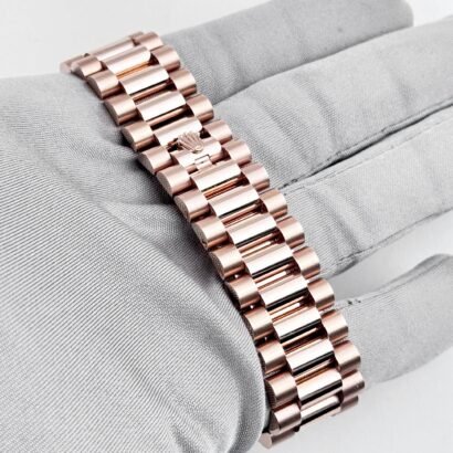 The Rolex Day-Date 228235 in 18k rose gold is a masterpiece of luxury and refinement, showcasing the brand’s dedication to craftsmanship and innovation. The 40mm case, crafted from Rolex’s proprietary rose gold alloy, radiates warmth and sophistication with its perfectly polished surfaces and signature fluted bezel that adds a touch of timeless elegance.