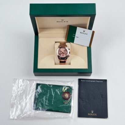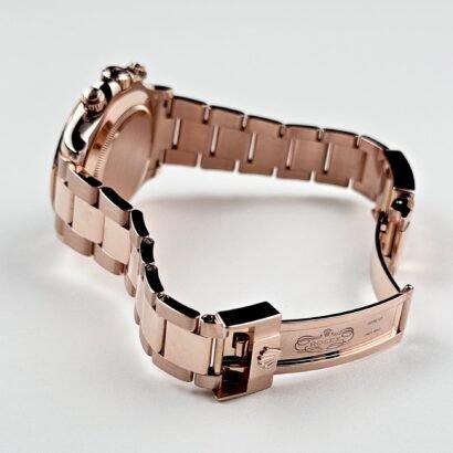 Equipped with the Rolex Calibre 4130, a self-winding mechanical movement developed and manufactured in-house, the Daytona 116505 offers unparalleled precision and reliability. The movement boasts a chronograph function, allowing for precise timekeeping and measuring elapsed time with utmost accuracy. The Oyster bracelet also made from 18k rose gold, ensures a comfortable and secure fit on the wrist. The Oysterlock clasp provides additional security, while the Easylink extension system allows for convenient adjustments to ensure the perfect fit at all times.