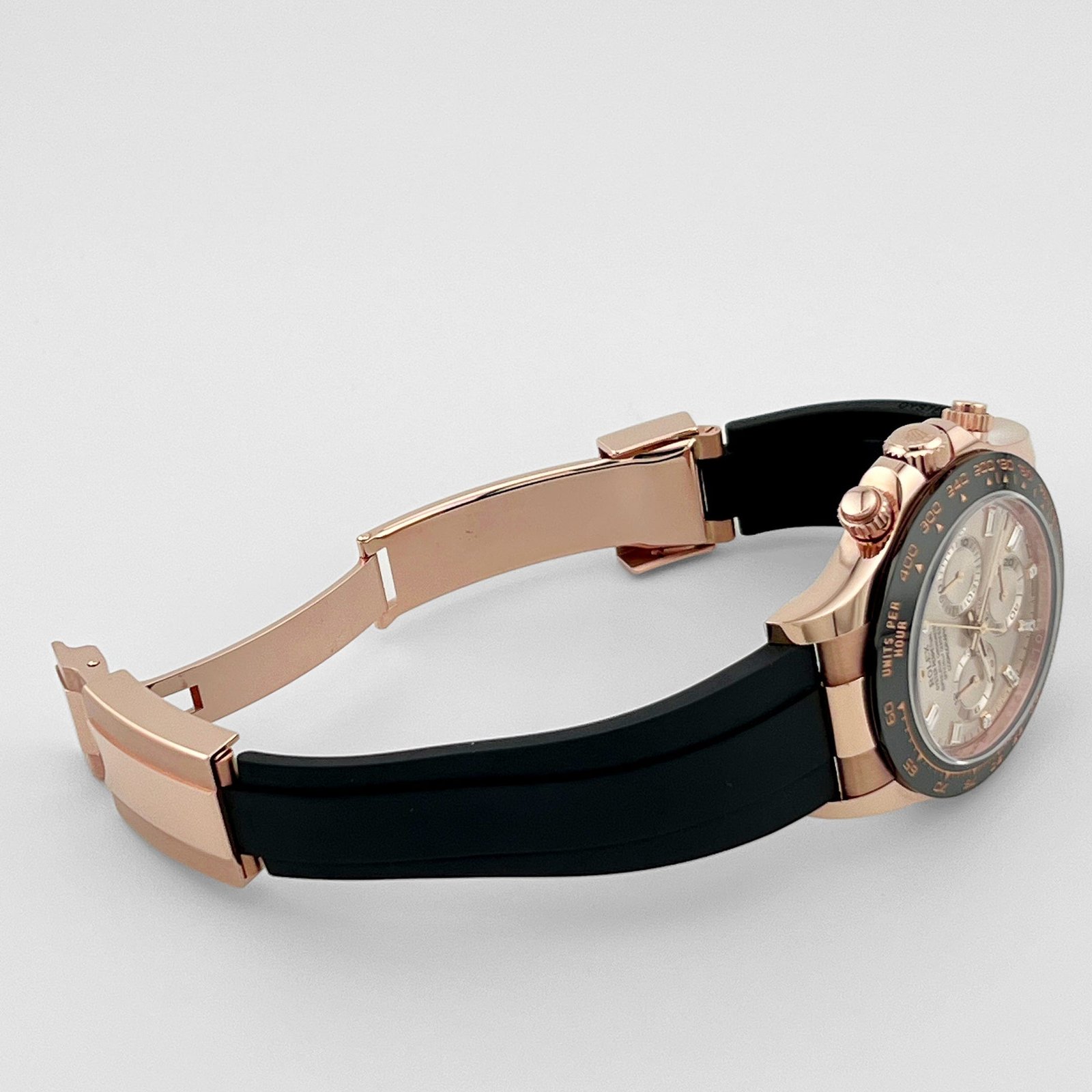 The Rolex Daytona 116515LN is a striking blend of high-performance chronograph functionality and luxurious design, crafted in 18k Everose gold. The 40mm Oyster case showcases a warm, refined aesthetic, complemented by a black Cerachrom bezel engraved with a tachymeter scale, reinforcing the Daytona’s motorsport heritage.