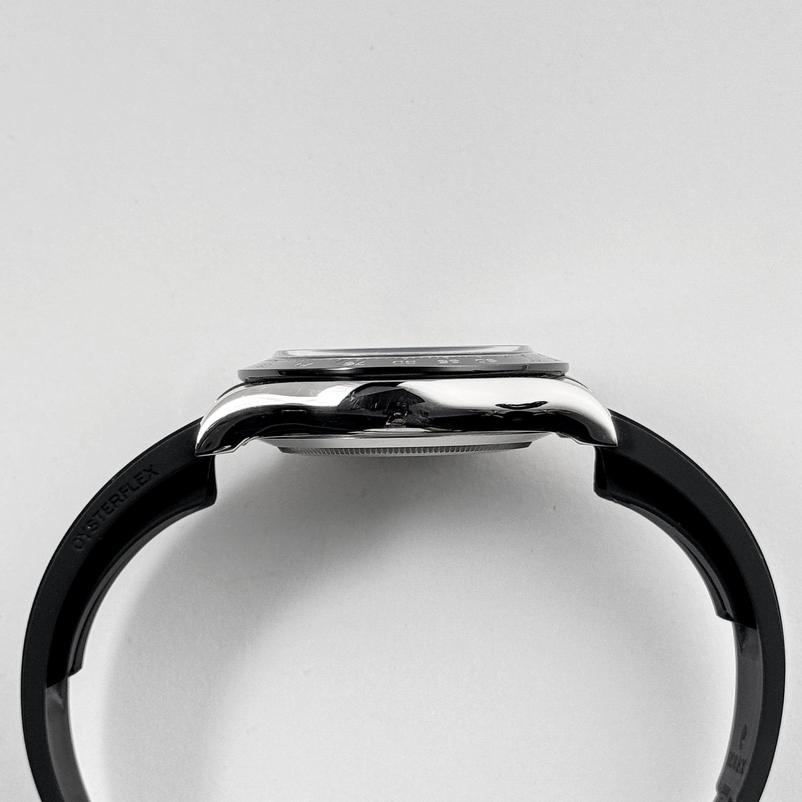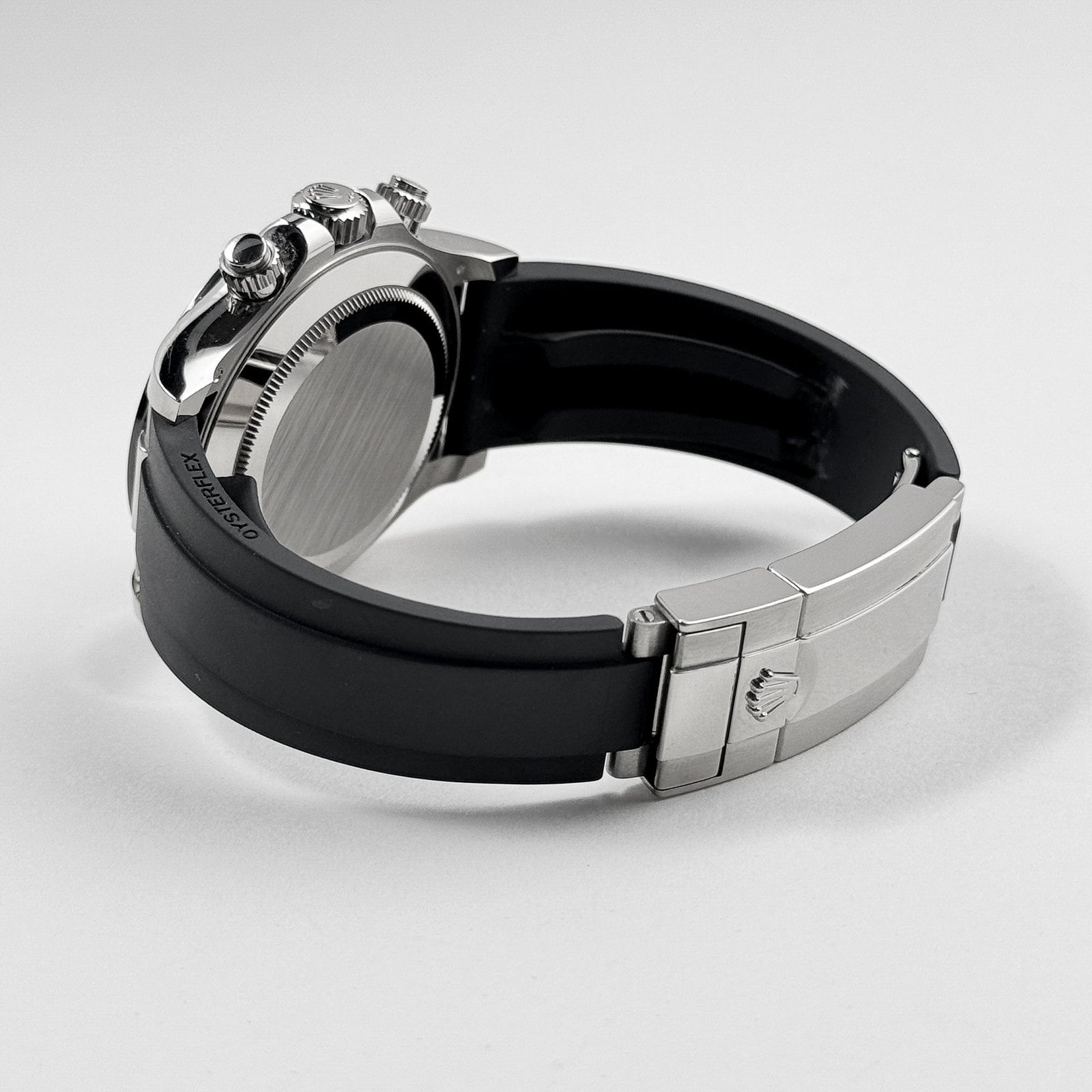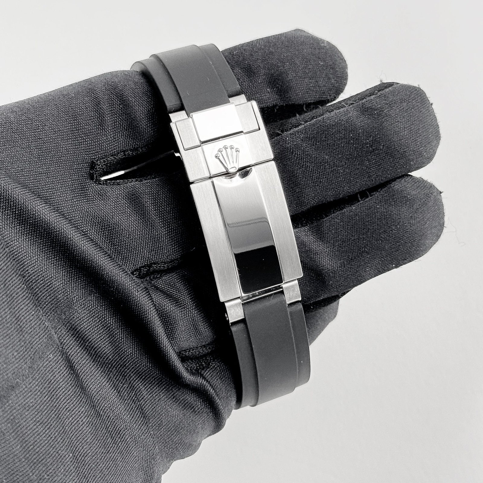 The watch is paired with a black Oysterflex bracelet—Rolex’s innovative elastomer strap reinforced with flexible metal blades—offering a sporty yet luxurious feel on the wrist. The Oysterlock safety clasp ensures secure wear, while the Easylink extension system provides quick micro-adjustments for perfect comfort.