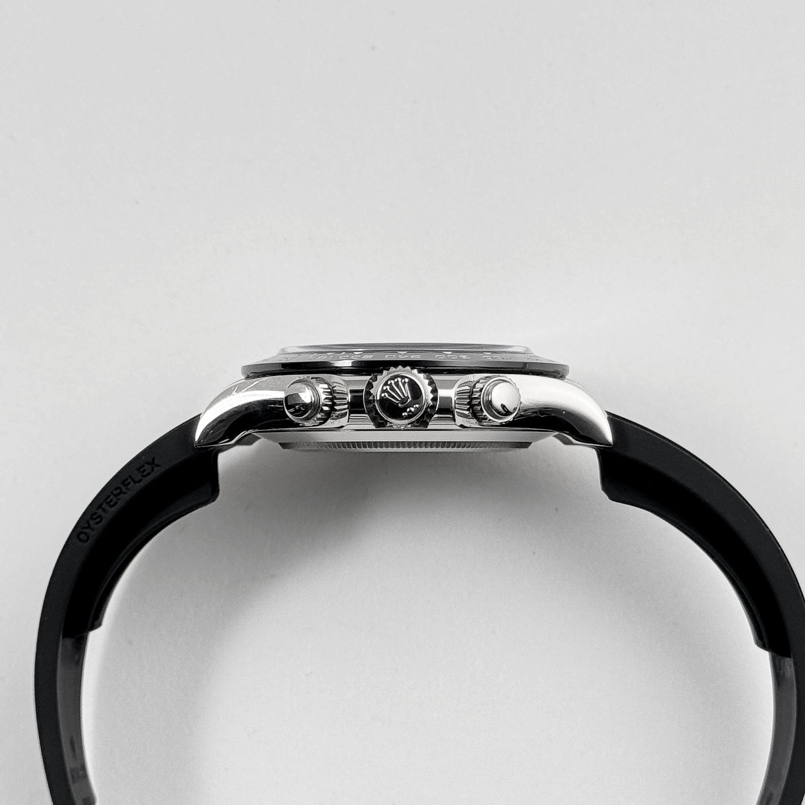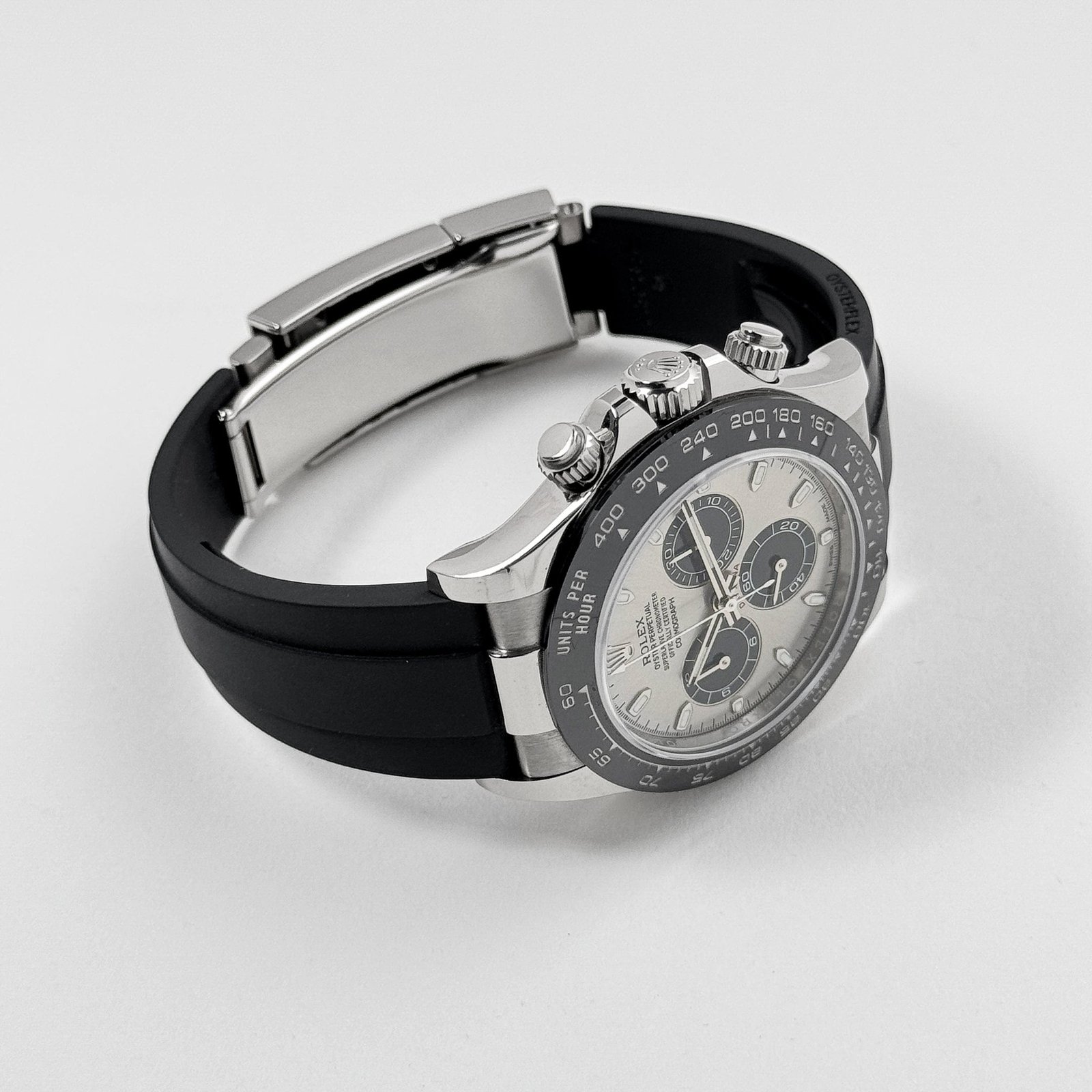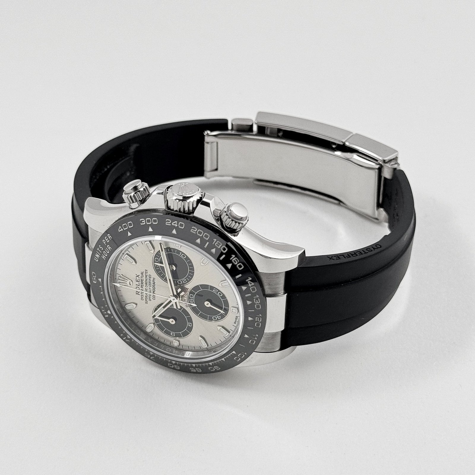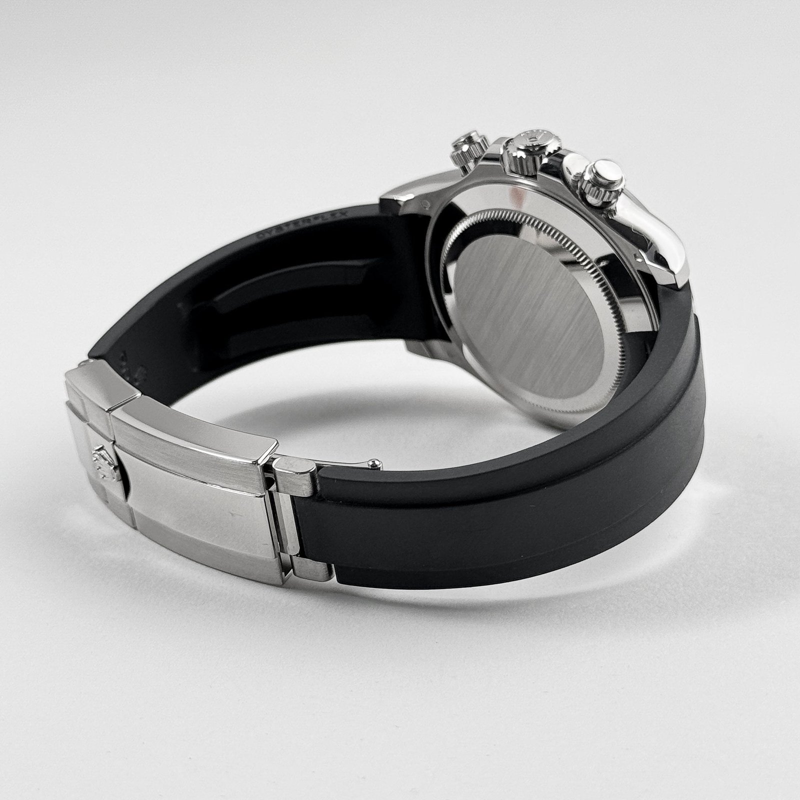 The watch is paired with a black Oysterflex bracelet—Rolex’s innovative elastomer strap reinforced with flexible metal blades—offering a sporty yet luxurious feel on the wrist. The Oysterlock safety clasp ensures secure wear, while the Easylink extension system provides quick micro-adjustments for perfect comfort.