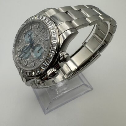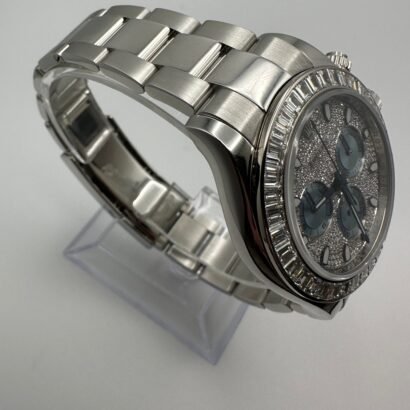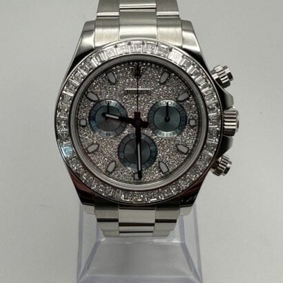 Adding to its allure, the watch features 36 baguette-cut diamonds on the bezel, further enhancing its luxurious aesthetic. The timepiece is styled on a platinum Oyster bracelet, featuring a folding Oysterclasp for a secure and comfortable fit on the wrist. Powered by the high-performance Caliber 4130 movement, the Rolex Daytona Oyster Perpetual boasts exceptional accuracy and reliability. Its chronograph and tachymeter functions make it the perfect companion for timing events with precision.