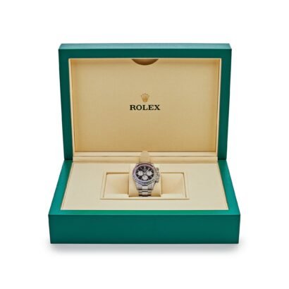 Paired with a robust 18k white gold Oyster bracelet, featuring polished center links and a secure Oysterlock clasp, this timepiece offers both comfort and a distinguished wrist presence. The Caliber 4130, Rolex’s proprietary self-winding chronograph movement, powers the Rainbow Daytona with precision, a 72-hour power reserve, and unparalleled reliability.