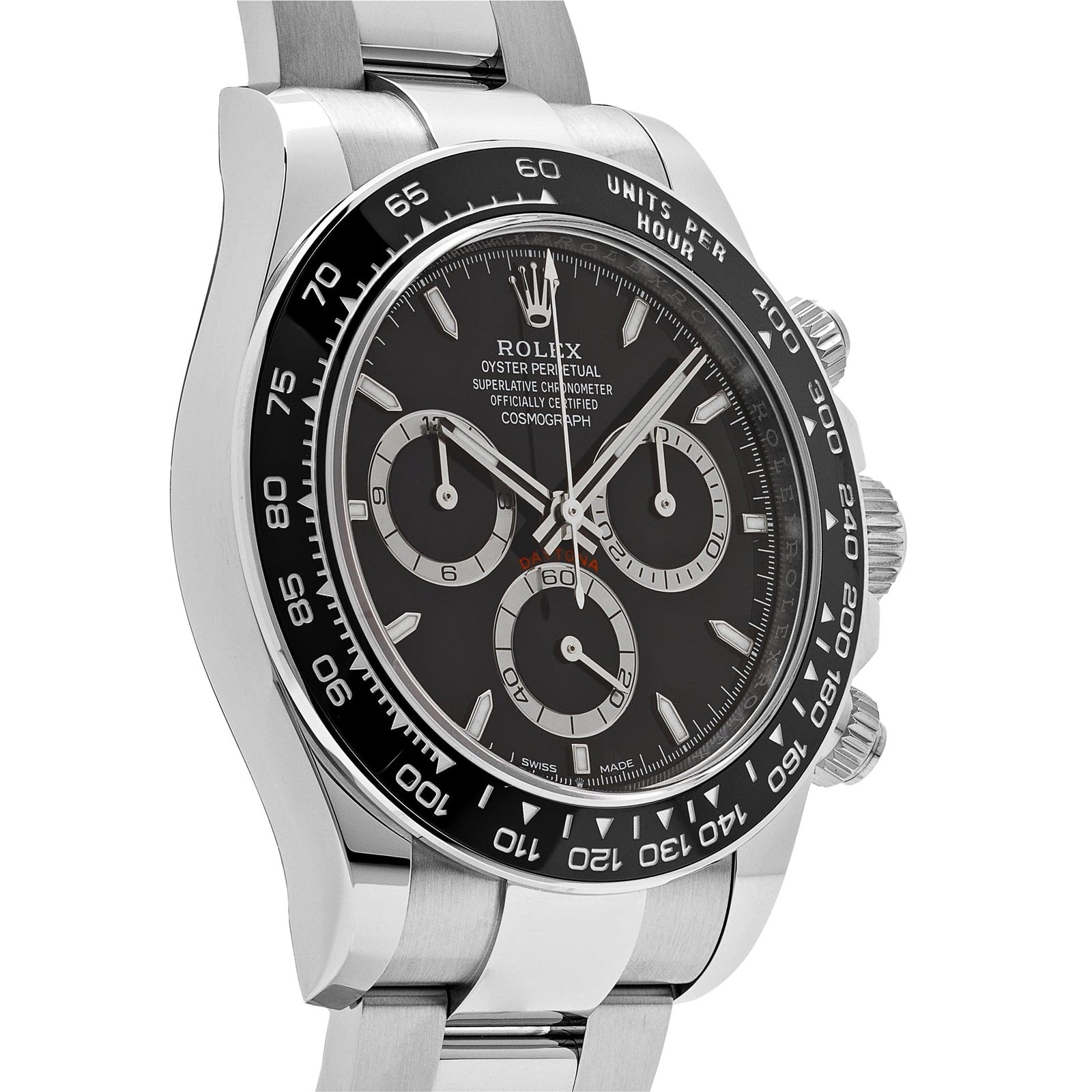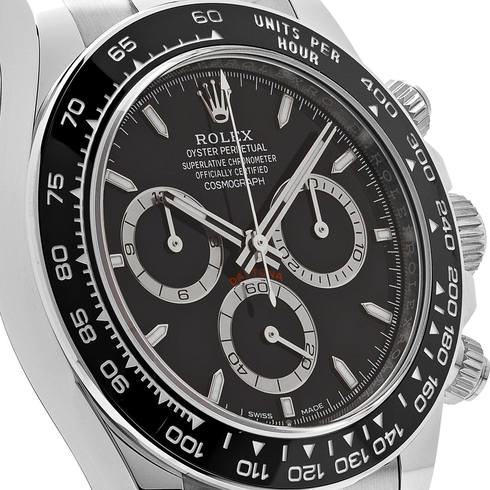 Powered by the Perpetual, mechanical chronograph, self-winding movement caliber 4131, manufactured by Rolex, this watch offers exceptional accuracy and reliability. Its impressive list of functions includes center hour and minute hands, a small seconds hand at 6 o’clock, and chronograph features such as a 30-minute counter at 3 o’clock and a 12-hour counter at 9 o’clock.