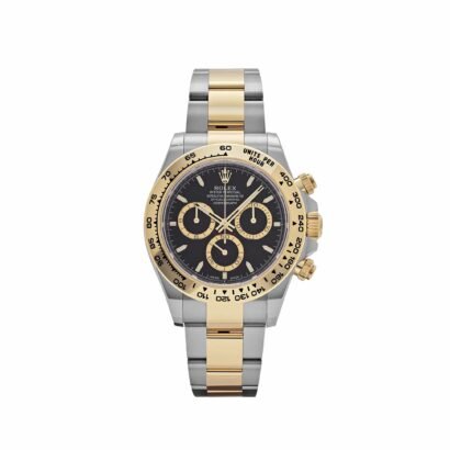 The black dial, a hallmark of sophistication, serves as the centerpiece of this model. Accented by yellow gold hour markers and Chromalight-filled hands, the dial offers exceptional legibility while maintaining a sleek and minimalist aesthetic. The signature Daytona subdial configuration features a 30-minute counter, 12-hour counter, and running seconds subdial, perfectly balancing practicality and design. The subdials’ gold accents complement the overall two-tone composition, adding an extra layer of refinement.