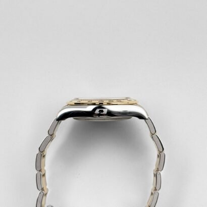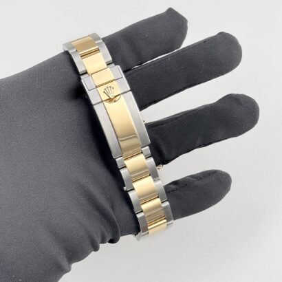 The watch is fitted with a two-tone Oyster bracelet combining brushed steel outer links and polished yellow gold center links, secured by the Oysterlock folding safety clasp with Easylink extension for added comfort.