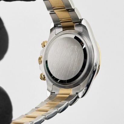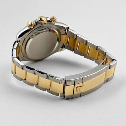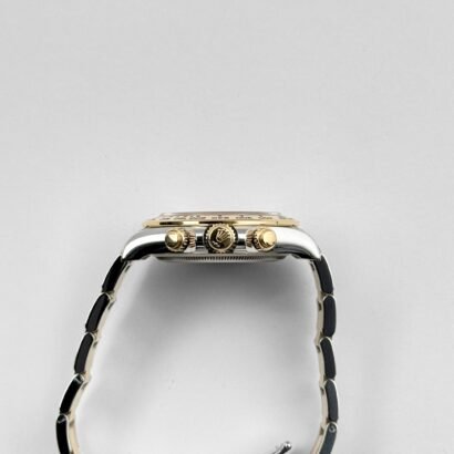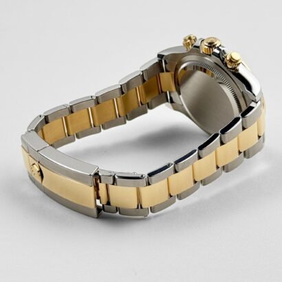 The 40mm Oyster case is constructed from Rolex’s corrosion-resistant steel with an 18k yellow gold bezel engraved with a tachymetric scale, used for calculating average speeds. The polished gold bezel contrasts strikingly with the brushed lugs and polished case flanks, offering visual richness from every angle. The screw-down pushers and Triplock crown help ensure water resistance to 100 meters, a hallmark of Daytona reliability.