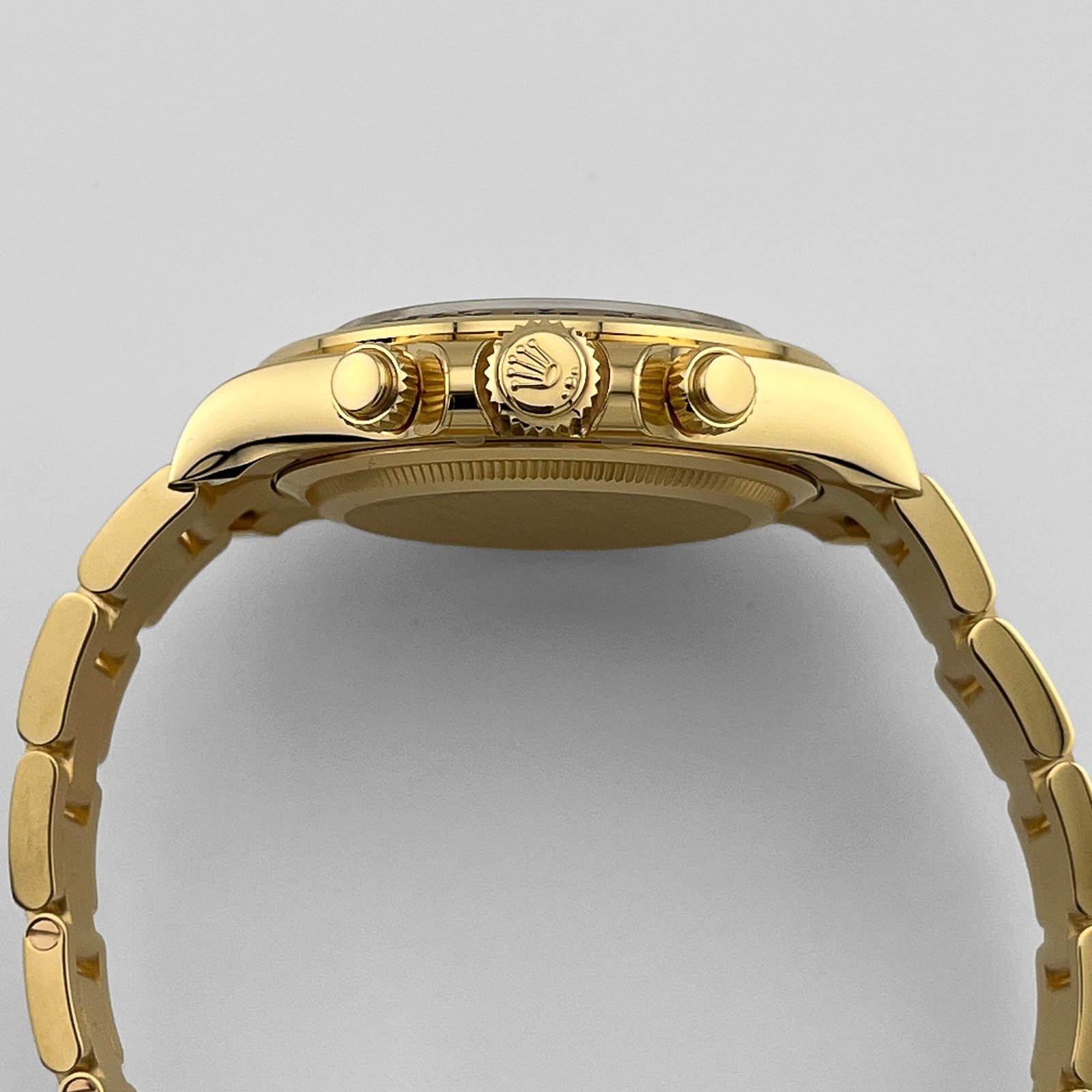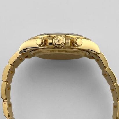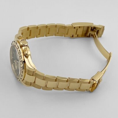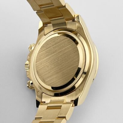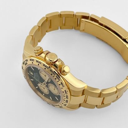 The fixed yellow gold bezel features the engraved tachymeter scale, a defining hallmark of the Daytona’s motorsport heritage. The pushers and crown are screw-down, contributing to the watch’s robust 100-meter water resistance while preserving the sleek profile of the case.