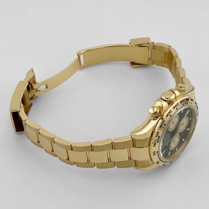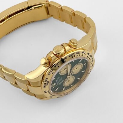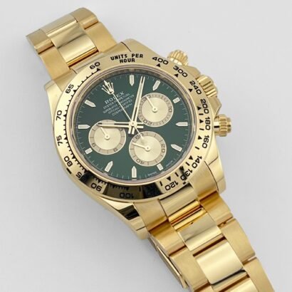 The Rolex Daytona 126508 with green dial is one of the most coveted configurations in the Cosmograph Daytona lineup, refreshed in 2025 with subtle design evolutions. Crafted in 18k yellow gold, its 40mm case retains the classic proportions of the Daytona while offering a sleeker, more refined silhouette thanks to the model’s updated geometry introduced in recent iterations.