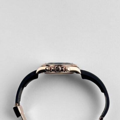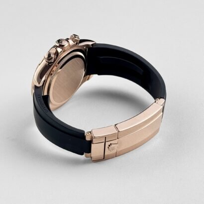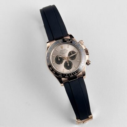 The Rolex Daytona 126515LN blends luxurious refinement with the spirit of motorsport. Crafted in 18k rose gold, the 40mm case features a sleek black Cerachrom bezel with a tachymeter scale—an essential for racing chronograph functionality. The combination of precious metal and high-tech ceramic gives the watch both visual depth and modern durability.