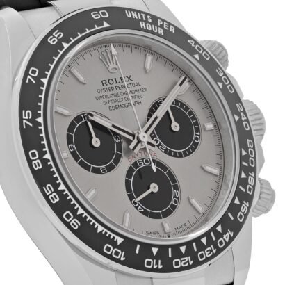 The Rolex Daytona 126519LN ‘Ghost’ delivers a subtle yet unmistakable presence, blending modern sophistication with the enduring spirit of the Cosmograph Daytona collection. Crafted from 18k white gold, the 40mm case showcases Rolex’s commitment to precious metals and flawless finishing, while the black Cerachrom ceramic bezel offers enhanced durability and a sleek, contemporary look.